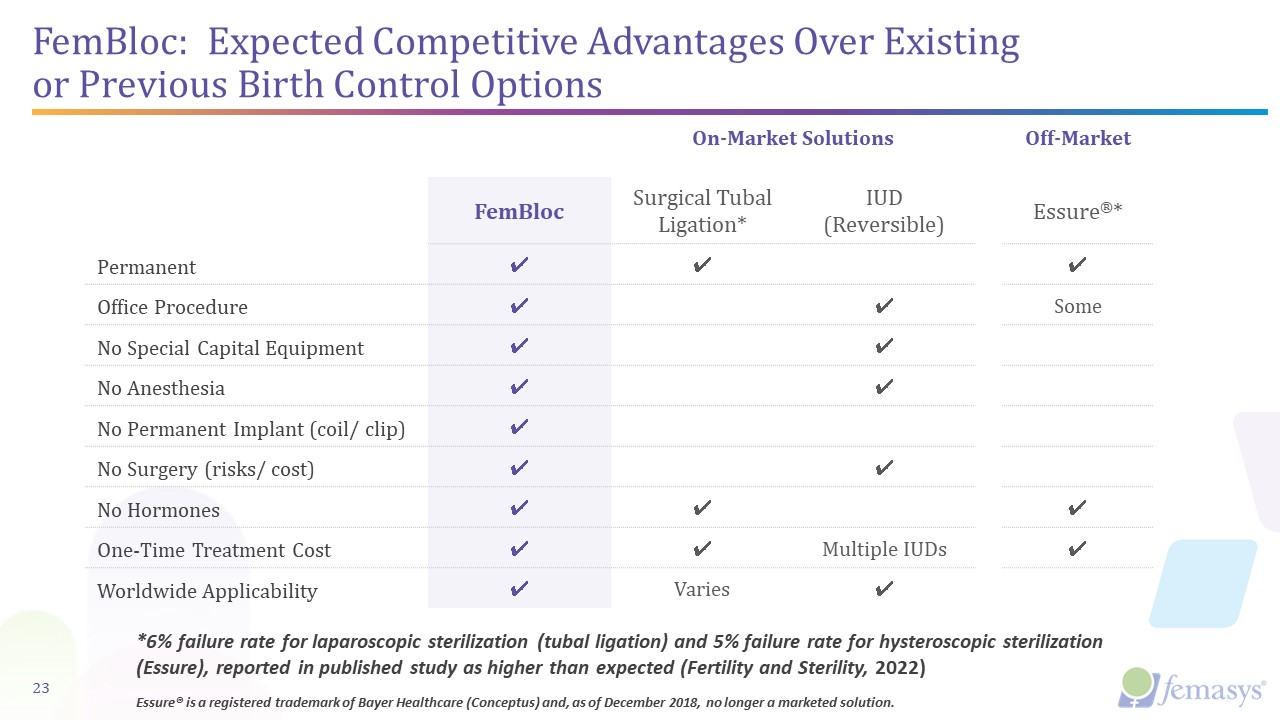 *6% failure rate for laparoscopic sterilization (tubal ligation) and 5% failure rate for hysteroscopic sterilization (Essure), reported in published study as higher than expected (Fertility and Sterility, 2022)     Essure® is a registered trademark of Bayer Healthcare (Conceptus) and, as of December 2018, no longer a marketed solution.  FemBloc: Expected Competitive Advantages Over Existing or Previous Birth Control Options  On-Market Solutions  Off-Market  FemBloc  Surgical Tubal Ligation*  IUD  (Reversible)  Essure®*  Permanent  ✔  ✔  ✔  Office Procedure  ✔  ✔  Some  No Special Capital Equipment   ✔  ✔  No Anesthesia  ✔  ✔  No Permanent Implant (coil/ clip)  ✔  No Surgery (risks/ cost)  ✔  ✔  No Hormones  ✔  ✔  ✔  One-Time Treatment Cost  ✔  ✔  Multiple IUDs  ✔  Worldwide Applicability  ✔  Varies  ✔  23