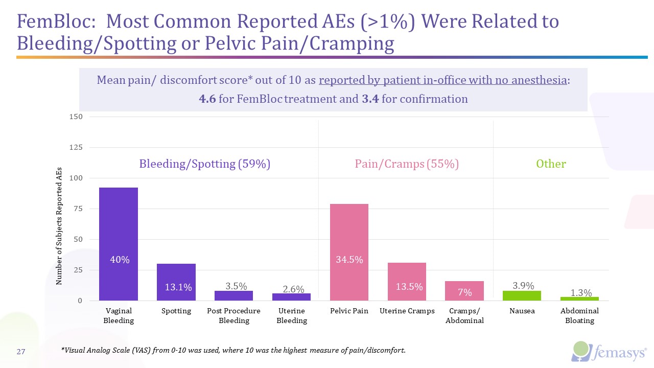 Bleeding/Spotting (59%)  Pain/Cramps (55%)  Other  40%  13.1%  3.5%  2.6%  34.5%  13.5%  7%  3.9%  1.3%  *Visual Analog Scale (VAS) from 0-10 was used, where 10 was the highest measure of pain/discomfort.  FemBloc: Most Common Reported AEs (>1%) Were Related to Bleeding/Spotting or Pelvic Pain/Cramping   Mean pain/ discomfort score* out of 10 as reported by patient in-office with no anesthesia:   4.6 for FemBloc treatment and 3.4 for confirmation  27
