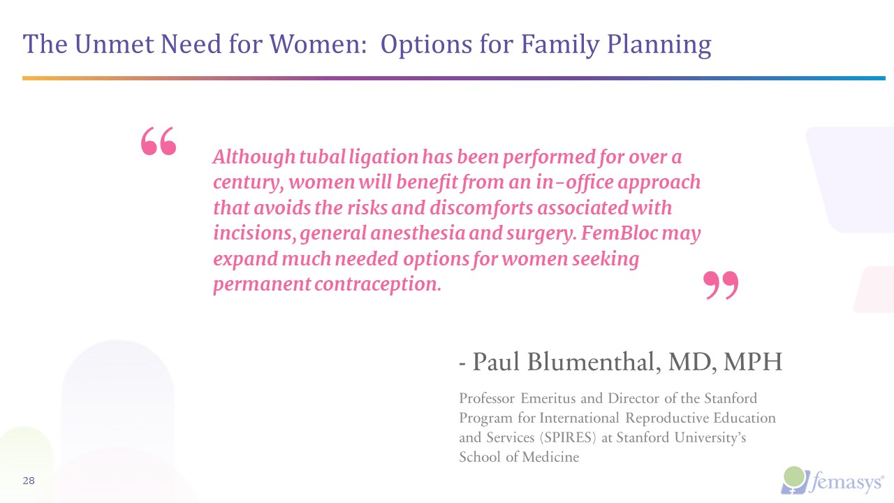 The Unmet Need for Women: Options for Family Planning  28  Although tubal ligation has been performed for over a century, women will benefit from an in-office approach that avoids the risks and discomforts associated with incisions, general anesthesia and surgery. FemBloc may expand much needed options for women seeking permanent contraception.  - Paul Blumenthal, MD, MPH  Professor Emeritus and Director of the Stanford Program for International Reproductive Education and Services (SPIRES) at Stanford University’s School of Medicine