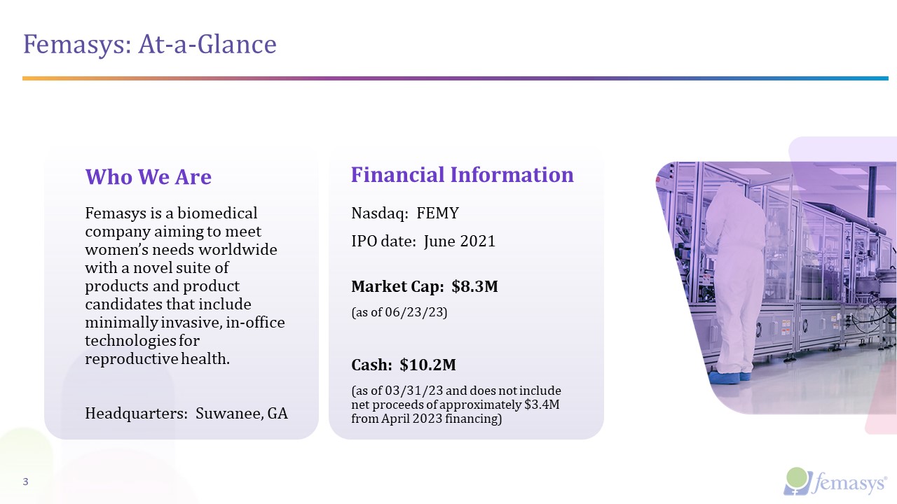 Femasys: At-a-Glance  Who We Are  Financial Information  Femasys is a biomedical company aiming to meet women’s needs worldwide with a novel suite of products and product candidates that include minimally invasive, in-office technologies for reproductive health.  Headquarters: Suwanee, GA  Nasdaq: FEMY  IPO date: June 2021   Market Cap: $8.3M  (as of 06/23/23)     Cash: $10.2M  (as of 03/31/23 and does not include net proceeds of approximately $3.4M from April 2023 financing)  3