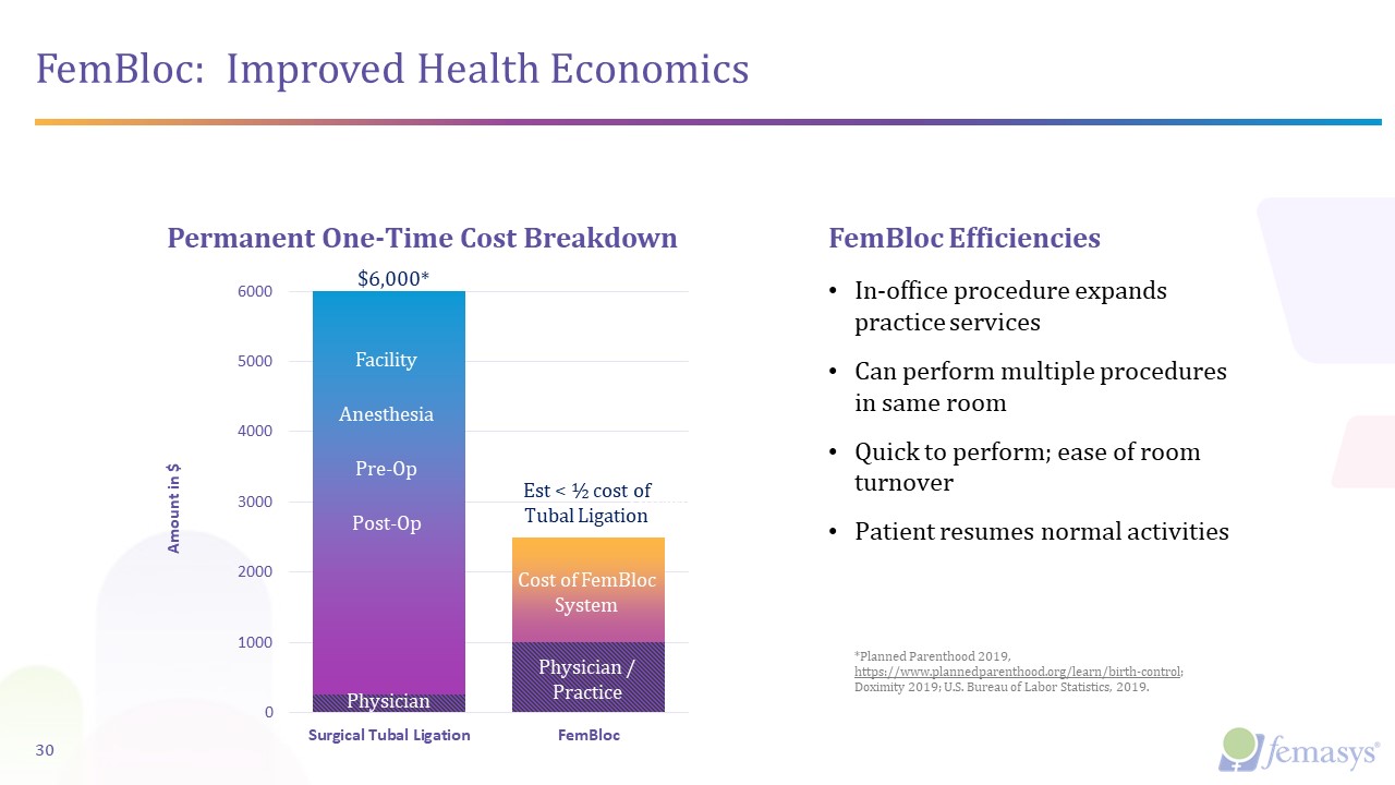 FemBloc: Improved Health Economics  Permanent One-Time Cost Breakdown  Pre-Op   $6,000*  Facility  Anesthesia  Post-Op  Cost of FemBloc System  Anesthesia  Physician / Practice  Est < ½ cost of Tubal Ligation  Physician  In-office procedure expands practice services  Can perform multiple procedures in same room  Quick to perform; ease of room turnover  Patient resumes normal activities  FemBloc Efficiencies  *Planned Parenthood 2019, https://www.plannedparenthood.org/learn/birth-control;Doximity 2019; U.S. Bureau of Labor Statistics, 2019.   30