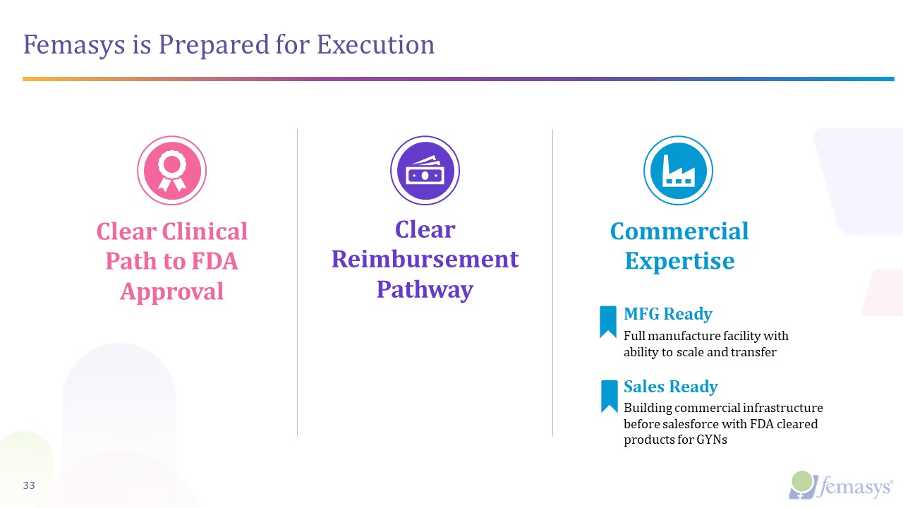 Femasys is Prepared for Execution  33  Clear Clinical Path to FDA Approval  Clear Reimbursement Pathway  Commercial Expertise  Full manufacture facility with ability to scale and transfer  MFG Ready  Sales Ready  Building commercial infrastructure before salesforce with FDA cleared products for GYNs