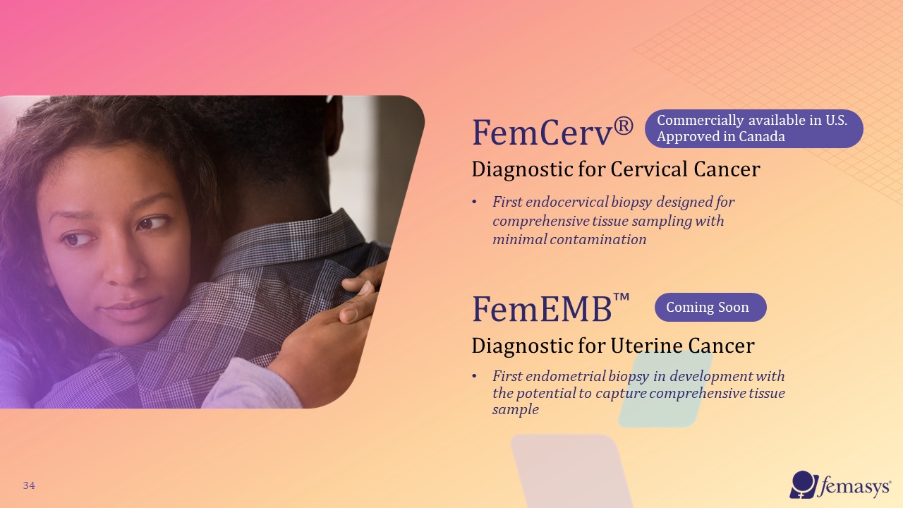 34  FemCerv®  Diagnostic for Cervical Cancer   First endocervical biopsy designed for comprehensive tissue sampling with minimal contamination  First endometrial biopsy in development with the potential to capture comprehensive tissue sample   FemEMB™  Diagnostic for Uterine Cancer  Coming Soon  Commercially available in U.S. Approved in Canada