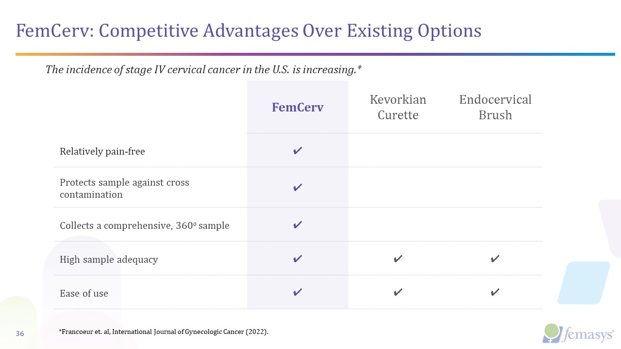 FemCerv: Competitive Advantages Over Existing Options  FemCerv  Kevorkian Curette  Endocervical Brush  Relatively pain-free   ✔  Protects sample against cross contamination  ✔  Collects a comprehensive, 360o sample   ✔  High sample adequacy  ✔  ✔  ✔  Ease of use  ✔  ✔  ✔  36  The incidence of stage IV cervical cancer in the U.S. is increasing.*  *Francoeur et. al, International Journal of Gynecologic Cancer (2022).