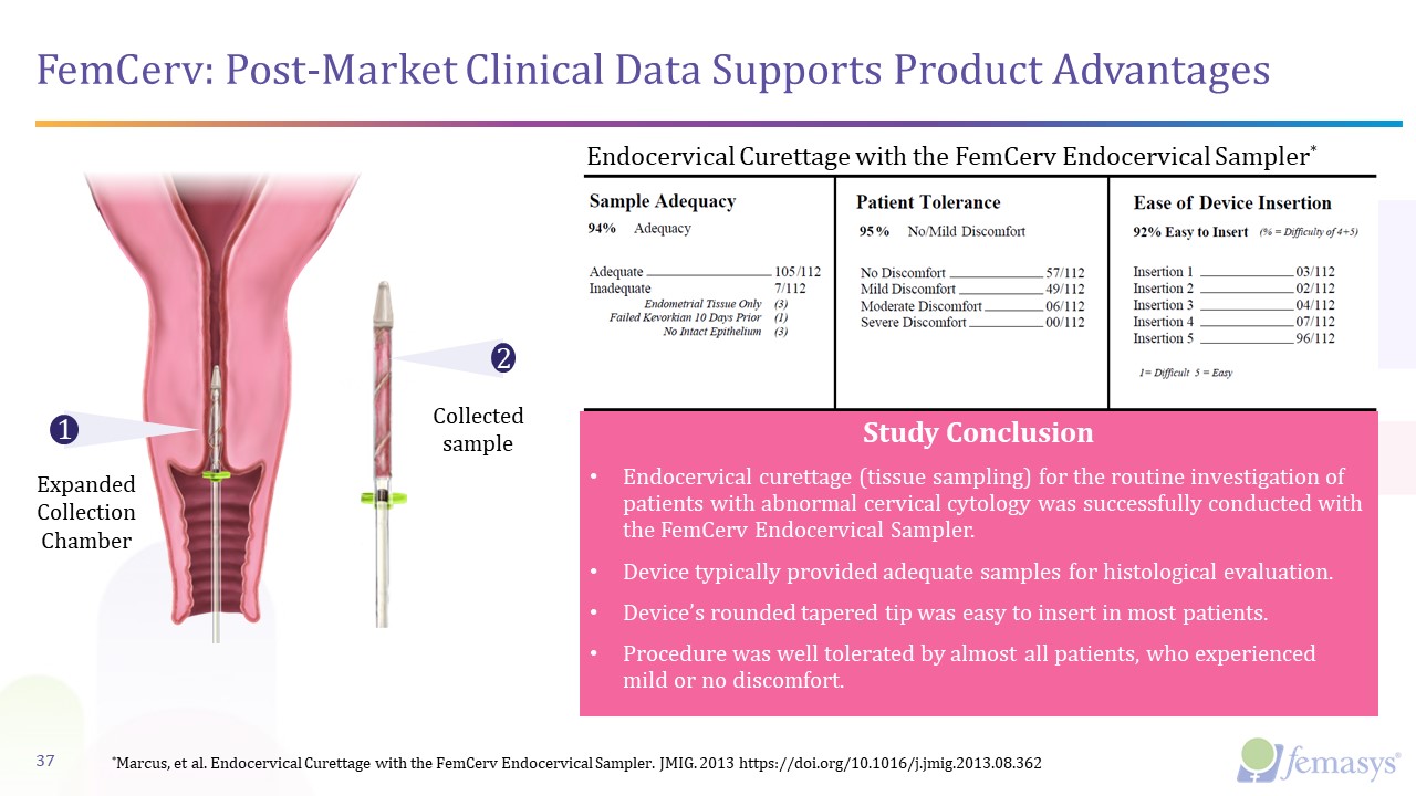 Expanded Collection   Chamber  FemCerv: Post-Market Clinical Data Supports Product Advantages  1  2  Collected sample  37  Study Conclusion  Endocervical curettage (tissue sampling) for the routine investigation of patients with abnormal cervical cytology was successfully conducted with the FemCerv Endocervical Sampler.  Device typically provided adequate samples for histological evaluation.   Device’s rounded tapered tip was easy to insert in most patients.   Procedure was well tolerated by almost all patients, who experienced mild or no discomfort.  Endocervical Curettage with the FemCerv Endocervical Sampler*  *Marcus, et al. Endocervical Curettage with the FemCerv Endocervical Sampler. JMIG. 2013 https://doi.org/10.1016/j.jmig.2013.08.362