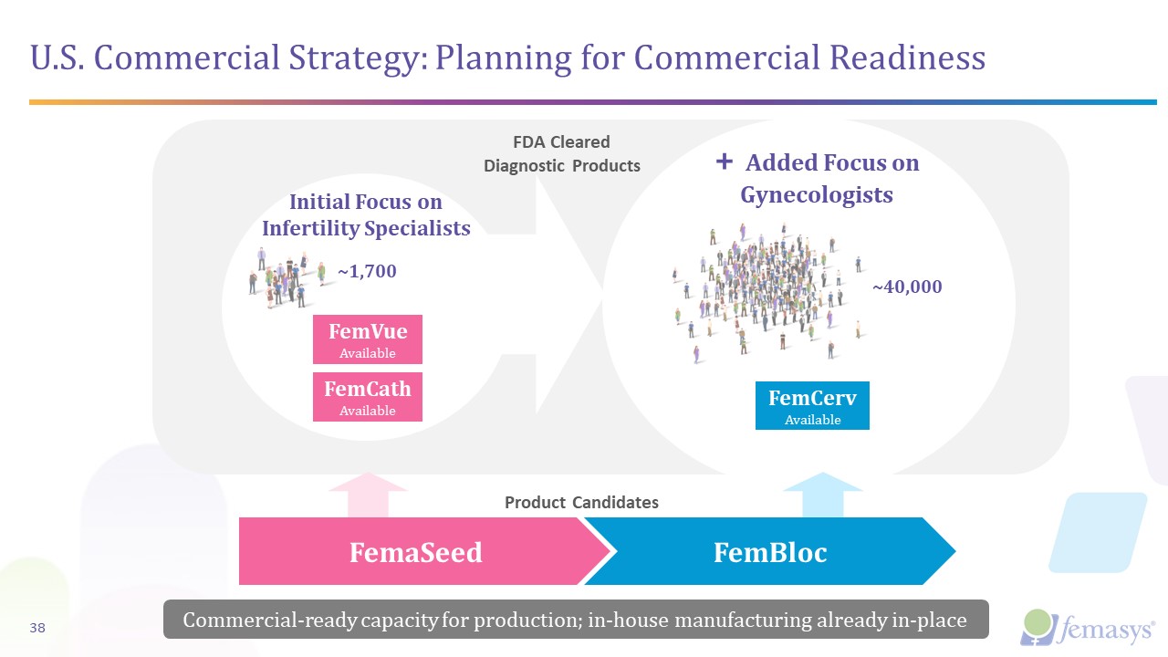 U.S. Commercial Strategy: Planning for Commercial Readiness   38  Initial Focus on Infertility Specialists   + Added Focus on Gynecologists  Product Candidates  FemaSeed  FemBloc  FemVue  Available  FemCath  Available  FemCerv  Available  FDA Cleared   Diagnostic Products  Commercial-ready capacity for production; in-house manufacturing already in-place  ~1,700  ~40,000