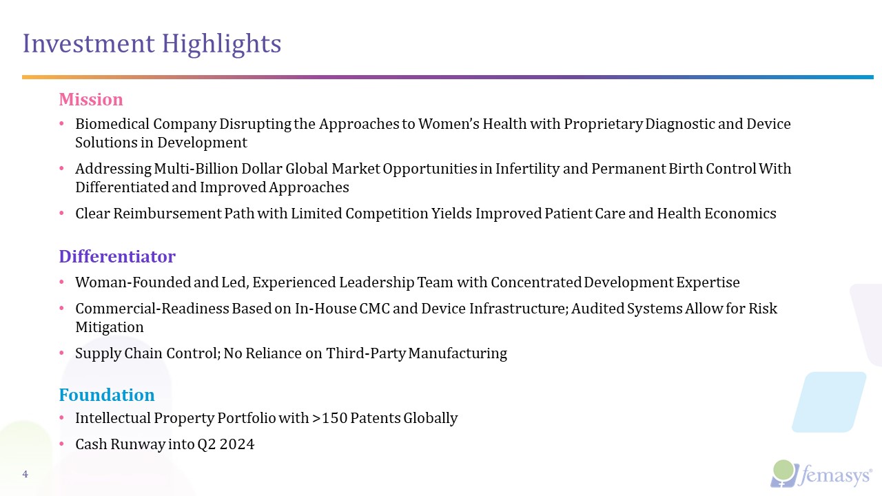 Investment Highlights  Biomedical Company Disrupting the Approaches to Women’s Health with Proprietary Diagnostic and Device Solutions in Development  Addressing Multi-Billion Dollar Global Market Opportunities in Infertility and Permanent Birth Control With Differentiated and Improved Approaches  Clear Reimbursement Path with Limited Competition Yields Improved Patient Care and Health Economics  40  Intellectual Property Portfolio with >150 Patents Globally  Cash Runway into Q2 2024  Woman-Founded and Led, Experienced Leadership Team with Concentrated Development Expertise  Commercial-Readiness Based on In-House CMC and Device Infrastructure; Audited Systems Allow for Risk Mitigation  Supply Chain Control; No Reliance on Third-Party Manufacturing  Mission  Differentiator  Foundation