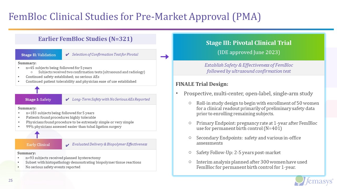 Summary:  n=183 subjects being followed for 5 years   Patients found procedures highly tolerable   Physicians found procedure to be extremely simple or very simple  99% physicians assessed easier than tubal ligation surgery  Summary:  n=93 subjects received planned hysterectomy   Subset with histopathology demonstrating biopolymer tissue reactions  No serious safety events reported  Summary:  n=45 subjects being followed for 5 years   Subjects received two confirmation tests (ultrasound and radiology)   Continued safety established; no serious AEs  Continued patient tolerability and physician ease of use established  FINALE Trial Design:  Prospective, multi-center, open-label, single-arm study  Roll-in study design to begin with 50 subjects for clinical readout of preliminary safety and performance data prior to enrolling remaining subjects.  Primary Endpoint: pregnancy rate at 1-year post confirmation test (N=401)  Secondary Endpoints: safety and various in-office assessments  Safety Follow-Up: 2-5 years post-market  Interim analysis planned after 300 subjects relying on FemBloc.  Establish Safety & Effectiveness of FemBloc  Selection of Confirmation Test for Pivotal  Long-Term Safety with No Serious AEs Reported  Evaluated Delivery & Biopolymer Effectiveness  FemBloc Clinical Studies for Pre-Market Approval (PMA)  SITE RECRUITMENT UNDERWAY  Early Clinical  Stage I: Safety  Stage II: Validation  Stage III: Pivotal Clinical Trial  (IDE approved June 2023)  25  ✔  ✔  ✔  Earlier FemBloc Studies (N=321)
