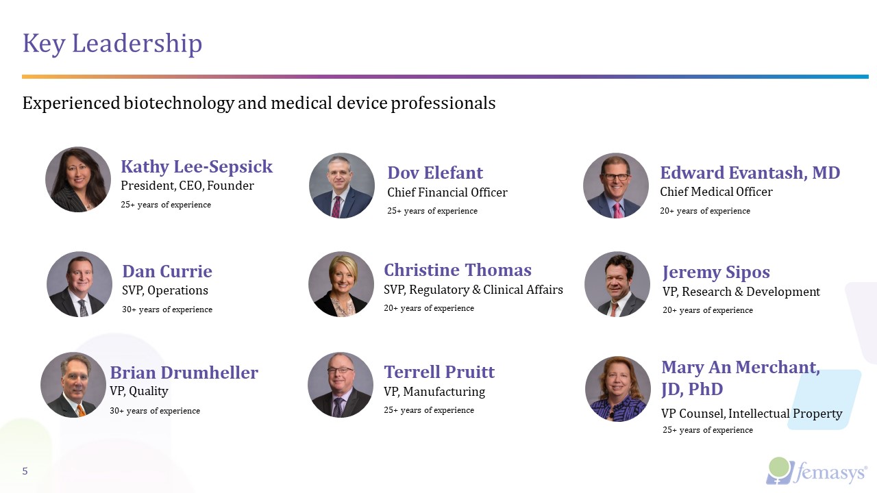 Investment Highlights  Biomedical Company Disrupting the Approaches to Women’s Health with Proprietary Diagnostic and Device Solutions in Development  Addressing Multi-Billion Dollar Global Market Opportunities in Infertility and Permanent Birth Control With Differentiated and Improved Approaches  Clear Reimbursement Path with Limited Competition Yields Improved Patient Care and Health Economics  4  Intellectual Property Portfolio with >150 Patents Globally  Cash Runway into Q2 2024  Woman-Founded and Led, Experienced Leadership Team with Concentrated Development Expertise  Commercial-Readiness Based on In-House CMC and Device Infrastructure; Audited Systems Allow for Risk Mitigation  Supply Chain Control; No Reliance on Third-Party Manufacturing  Mission  Differentiator  Foundation