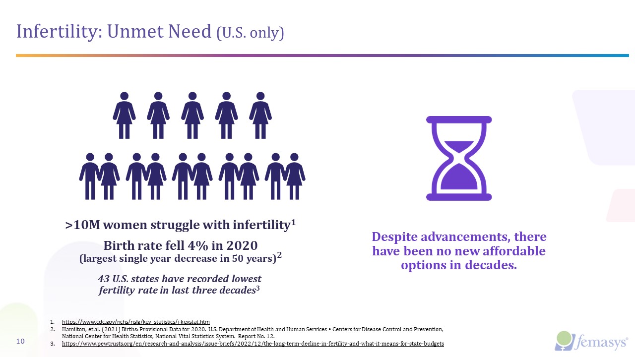 Infertility: Unmet Need (U.S. only)   >10M women struggle with infertility1  Birth rate fell 4% in 2020 (largest single year decrease in 50 years)2  Despite advancements, there have been no new affordable options in decades.  10  https://www.cdc.gov/nchs/nsfg/key_statistics/i-keystat.htm  Hamilton, et al. (2021) Births: Provisional Data for 2020. U.S. Department of Health and Human Services • Centers for Disease Control and Prevention, National Center for Health Statistics, National Vital Statistics System. Report No. 12.  https://www.pewtrusts.org/en/research-and-analysis/issue-briefs/2022/12/the-long-term-decline-in-fertility-and-what-it-means-for-state-budgets   43 U.S. states have recorded lowest fertility rate in last three decades3