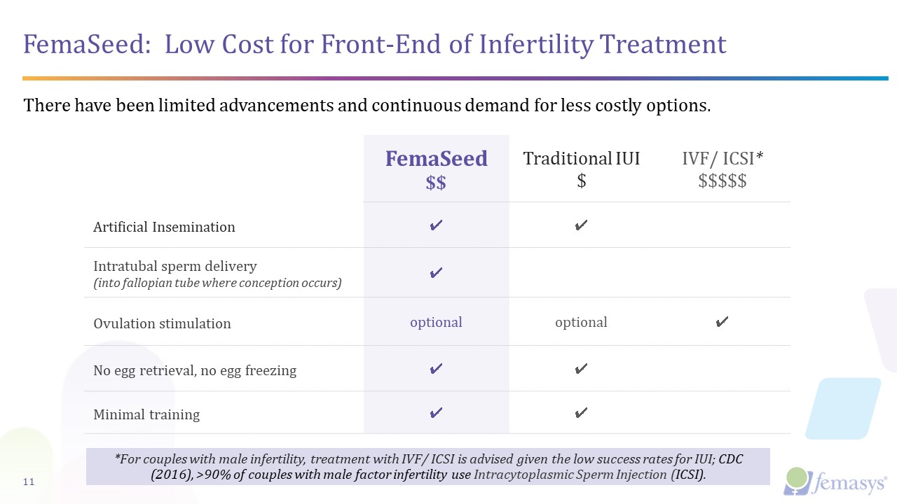 FemaSeed: Low Cost for Front-End of Infertility Treatment  FemaSeed  $$  Traditional IUI  $  IVF/ ICSI*  $$$$$  Artificial Insemination  ✔  ✔  Intratubal sperm delivery   (into fallopian tube where conception occurs)  ✔  Ovulation stimulation  optional  optional  ✔  No egg retrieval, no egg freezing  ✔  ✔  Minimal training  ✔  ✔  11  There have been limited advancements and continuous demand for less costly options.  *For couples with male infertility, treatment with IVF/ ICSI is advised given the low success rates for IUI; CDC (2016), >90% of couples with male factor infertility use Intracytoplasmic Sperm Injection (ICSI).