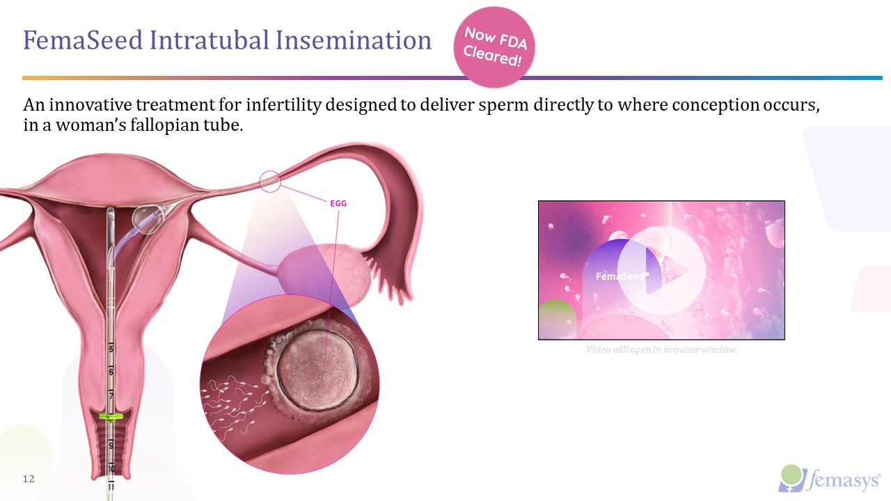 FemaSeed Intratubal Insemination  An innovative treatment for infertility designed to deliver sperm directly to where conception occurs, in a woman’s fallopian tube.  12  Undirected sperm delivery to cavity (IUI) is first-line treatment despite low success rates  Video will open in browser window.