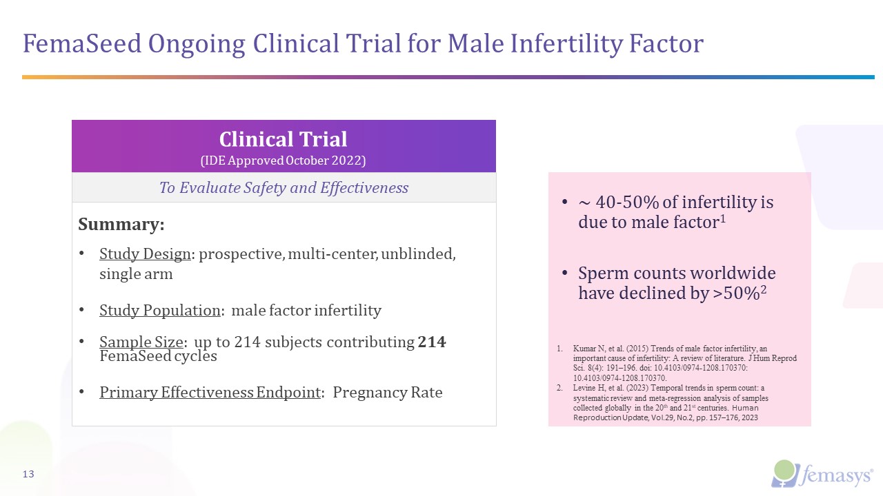 Summary:  Study Design: prospective, multi-center, unblinded, single arm  Study Population: male factor infertility  Sample Size: up to 214 subjects contributing 214 FemaSeed cycles   Primary Effectiveness Endpoint: Pregnancy Rate      FemaSeed Ongoing Clinical Trial for Male Infertility Factor  SITE RECRUITMENT UNDERWAY  Clinical Trial(IDE Approved October 2022)  13  To Evaluate Safety and Effectiveness  ~ 40-50% of infertility is due to male factor1  Sperm counts worldwide have declined by >50%2  Kumar N, et al. (2015) Trends of male factor infertility, an important cause of infertility: A review of literature. J Hum Reprod Sci. 8(4): 191–196. doi: 10.4103/0974-1208.170370: 10.4103/0974-1208.170370.  Levine H, et al. (2023) Temporal trends in sperm count: a systematic review and meta-regression analysis of samples collected globally in the 20th and 21st centuries. Human Reproduction Update, Vol.29, No.2, pp. 157–176, 2023
