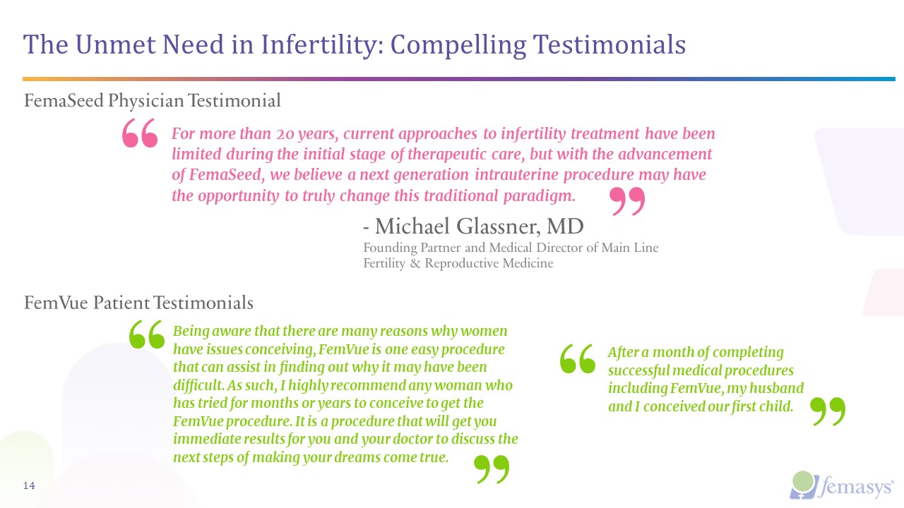 The Unmet Need in Infertility: Compelling Testimonials  14  For more than 20 years, current approaches to infertility treatment have been limited during the initial stage of therapeutic care, but with the advancement of FemaSeed, we believe a next generation intrauterine procedure may have the opportunity to truly change this traditional paradigm.  - Michael Glassner, MD  Founding Partner and Medical Director of Main Line Fertility & Reproductive Medicine  FemaSeed Physician Testimonial  FemVue Patient Testimonials  Being aware that there are many reasons why women have issues conceiving, FemVue is one easy procedure that can assist in finding out why it may have been difficult. As such, I highly recommend any woman who has tried for months or years to conceive to get the FemVue procedure. It is a procedure that will get you immediate results for you and your doctor to discuss the next steps of making your dreams come true.  After a month of completing successful medical procedures including FemVue, my husband and I conceived our first child.