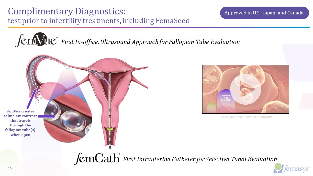 First In-office, Ultrasound Approach for Fallopian Tube Evaluation  FemVue creates saline-air contrast that travels through the fallopian tube(s) when open  15  First Intrauterine Catheter for Selective Tubal Evaluation  Complimentary Diagnostics: test prior to infertility treatments, including FemaSeed   Approved in U.S., Japan, and Canada  Video will open in browser window.