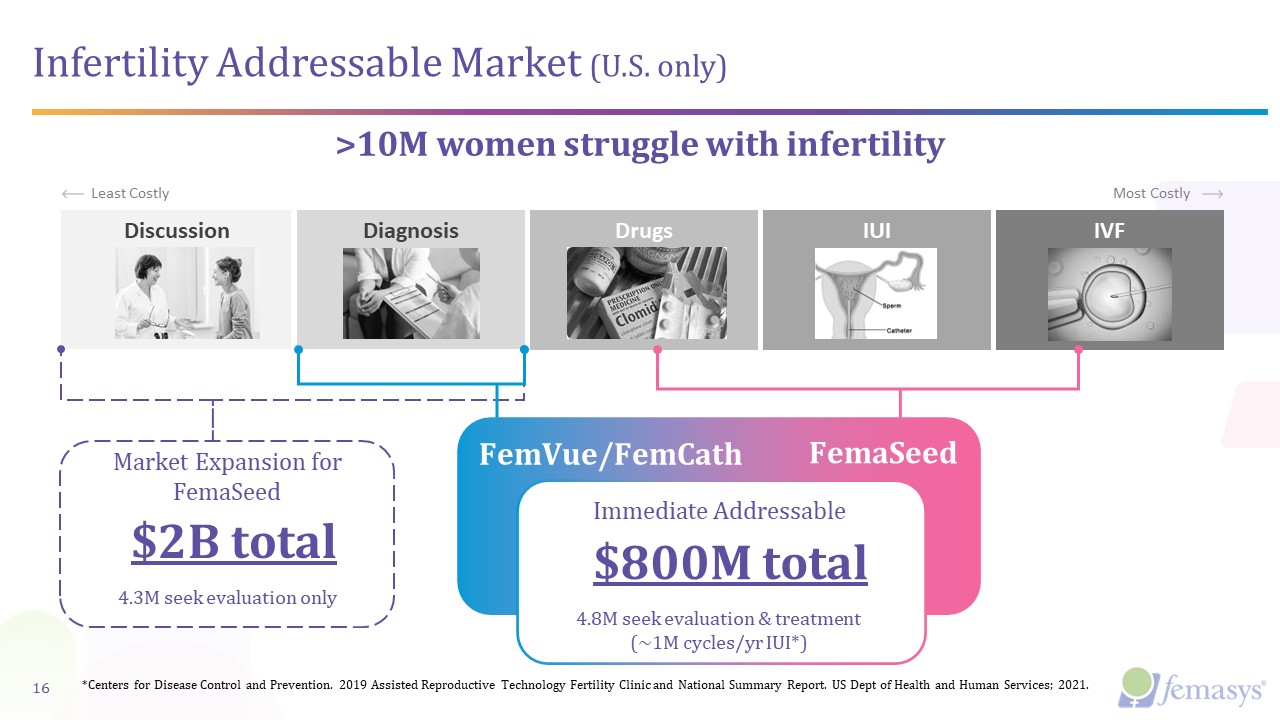 Diagnosis  Discussion  Drugs  IUI  IVF  Infertility Addressable Market (U.S. only)  16  Least Costly  Most Costly  seek evaluation & treatment (1.4M IUI)  FemVue/FemCath  FemaSeed  $2B total  4.3M seek evaluation only  Market Expansion for FemaSeed  $800M total  Immediate Addressable  4.8M seek evaluation & treatment (~1M cycles/yr IUI*)  >10M women struggle with infertility  *Centers for Disease Control and Prevention. 2019 Assisted Reproductive Technology Fertility Clinic and National Summary Report. US Dept of Health and Human Services; 2021.