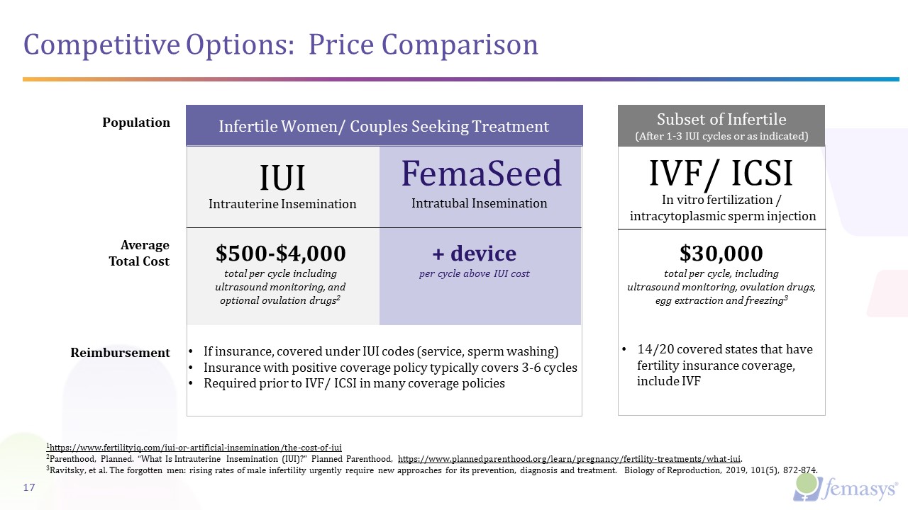 Competitive Options: Price Comparison  17  IUI  Intrauterine Insemination  FemaSeed  $500-$4,000  total per cycle including   ultrasound monitoring, and   optional ovulation drugs2  + device  per cycle above IUI cost  Average  Total Cost  1https://www.fertilityiq.com/iui-or-artificial-insemination/the-cost-of-iui  2Parenthood, Planned. “What Is Intrauterine Insemination (IUI)?” Planned Parenthood, https://www.plannedparenthood.org/learn/pregnancy/fertility-treatments/what-iui.  3Ravitsky, et al. The forgotten men: rising rates of male infertility urgently require new approaches for its prevention, diagnosis and treatment. Biology of Reproduction, 2019, 101(5), 872-874.  IVF/ ICSI  In vitro fertilization /   intracytoplasmic sperm injection  $30,000  total per cycle, including   ultrasound monitoring, ovulation drugs,   egg extraction and freezing3  Population  If insurance, covered under IUI codes (service, sperm washing)  Insurance with positive coverage policy typically covers 3-6 cycles  Required prior to IVF/ ICSI in many coverage policies  Infertile Women/ Couples Seeking Treatment  Subset of Infertile (After 1-3 IUI cycles or as indicated)  Intratubal Insemination  Reimbursement  14/20 covered states that have fertility insurance coverage, include IVF