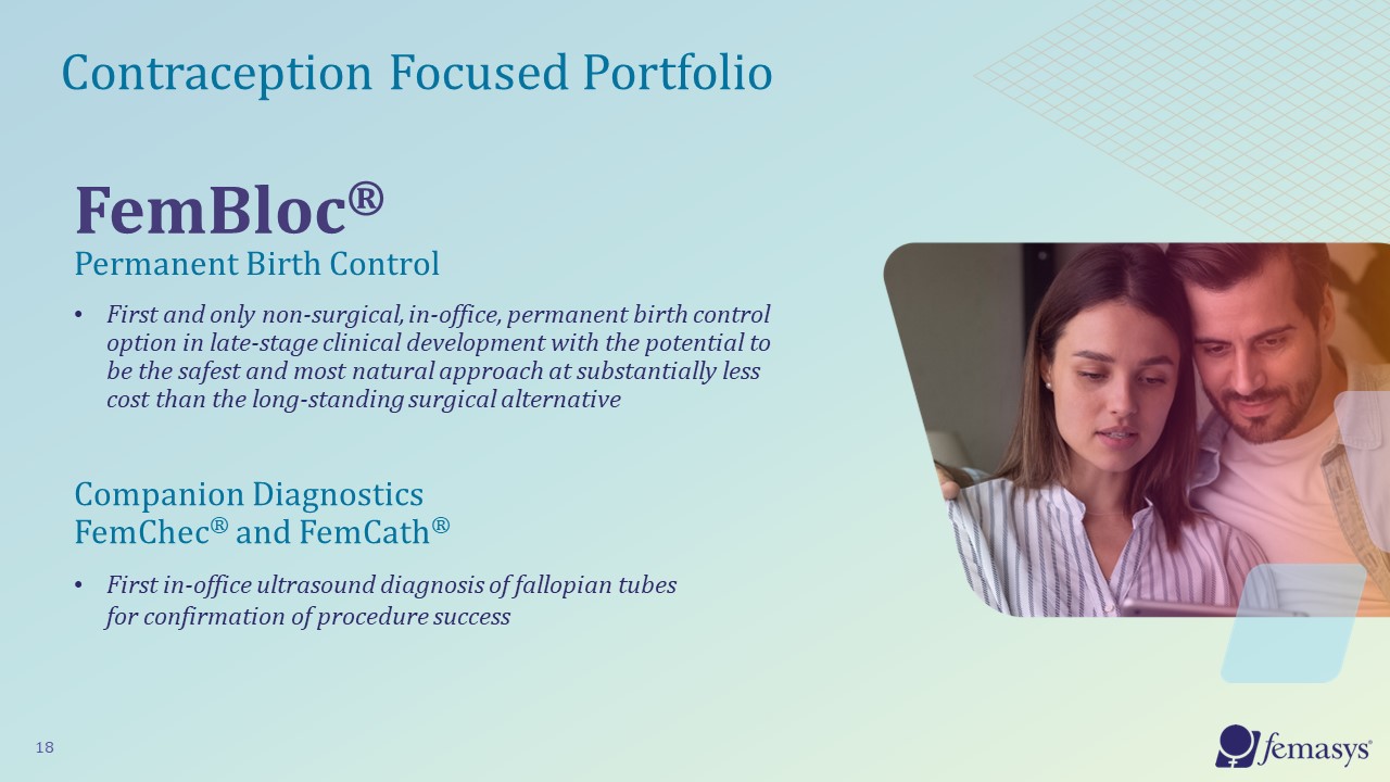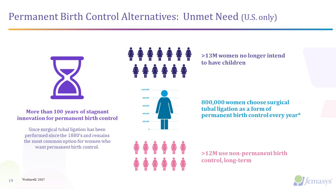 FemBloc®  Permanent Birth Control  18  First and only non-surgical, in-office, permanent birth control option in late-stage clinical development with the potential to be the safest and most natural approach at substantially less cost than the long-standing surgical alternative  Companion Diagnostics FemChec® and FemCath®  First in-office ultrasound diagnosis of fallopian tubes for confirmation of procedure success  Contraception Focused Portfolio