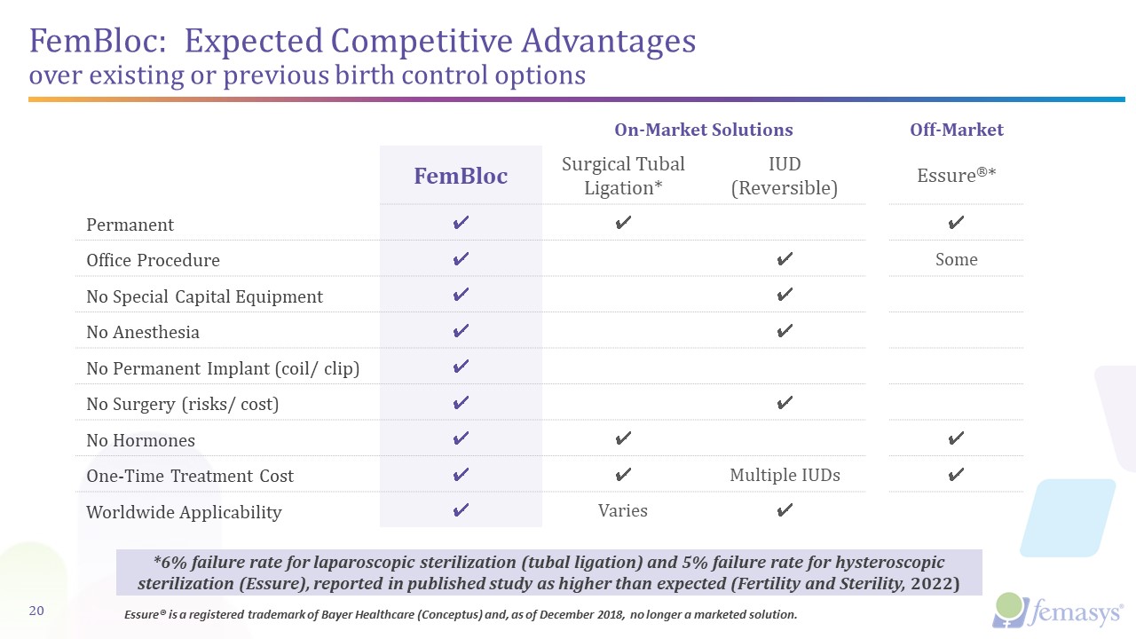Essure® is a registered trademark of Bayer Healthcare (Conceptus) and, as of December 2018, no longer a marketed solution.  FemBloc: Expected Competitive Advantages over existing or previous birth control options  On-Market Solutions  Off-Market  FemBloc  Surgical Tubal Ligation*  IUD  (Reversible)  Essure®*  Permanent  ✔  ✔  ✔  Office Procedure  ✔  ✔  Some  No Special Capital Equipment   ✔  ✔  No Anesthesia  ✔  ✔  No Permanent Implant (coil/ clip)  ✔  No Surgery (risks/ cost)  ✔  ✔  No Hormones  ✔  ✔  ✔  One-Time Treatment Cost  ✔  ✔  Multiple IUDs  ✔  Worldwide Applicability  ✔  Varies  ✔  20  *6% failure rate for laparoscopic sterilization (tubal ligation) and 5% failure rate for hysteroscopic sterilization (Essure), reported in published study as higher than expected (Fertility and Sterility, 2022)