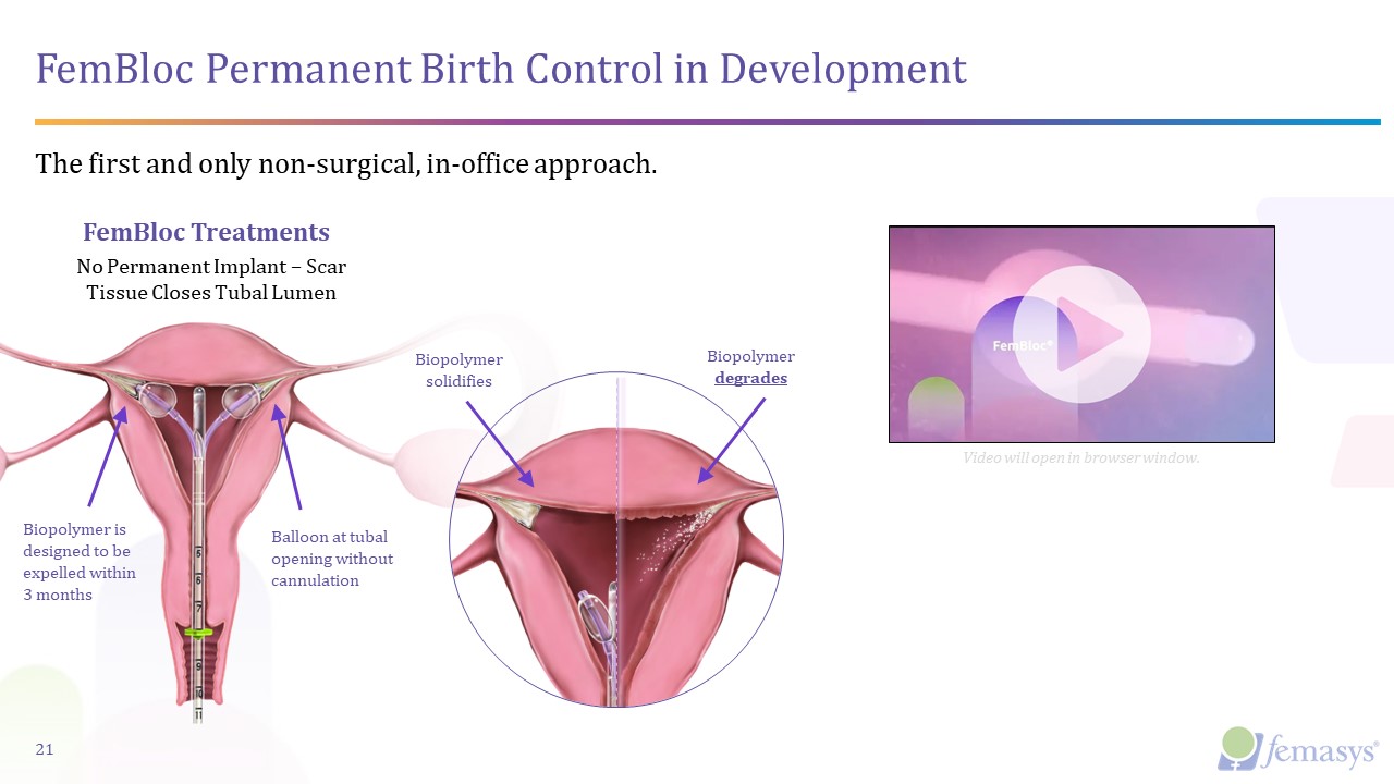 No Permanent Implant – Scar Tissue Closes Tubal Lumen  FemBloc Treatments  FemBloc Permanent Birth Control in Development  The first and only non-surgical, in-office approach.  Balloon at tubal opening without cannulation  Biopolymer is designed to be expelled within 3 months  Biopolymer solidifies  21  Video will open in browser window.  Biopolymer degrades
