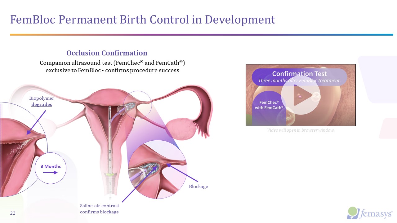 Companion ultrasound test (FemChec® and FemCath®) exclusive to FemBloc - confirms procedure success  Occlusion Confirmation  FemBloc Permanent Birth Control in Development  3 Months  Blockage  Biopolymer degrades  Saline-air contrast confirms blockage  22  Video will open in browser window.