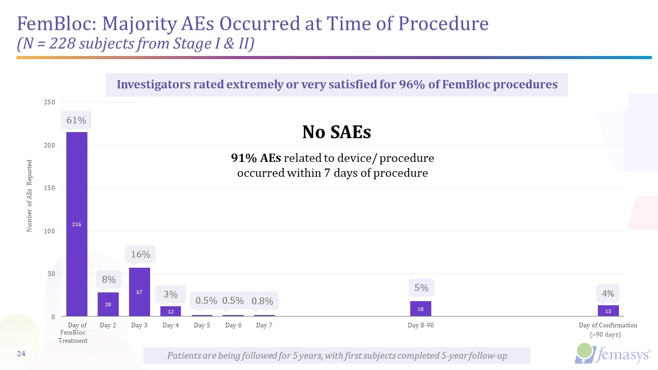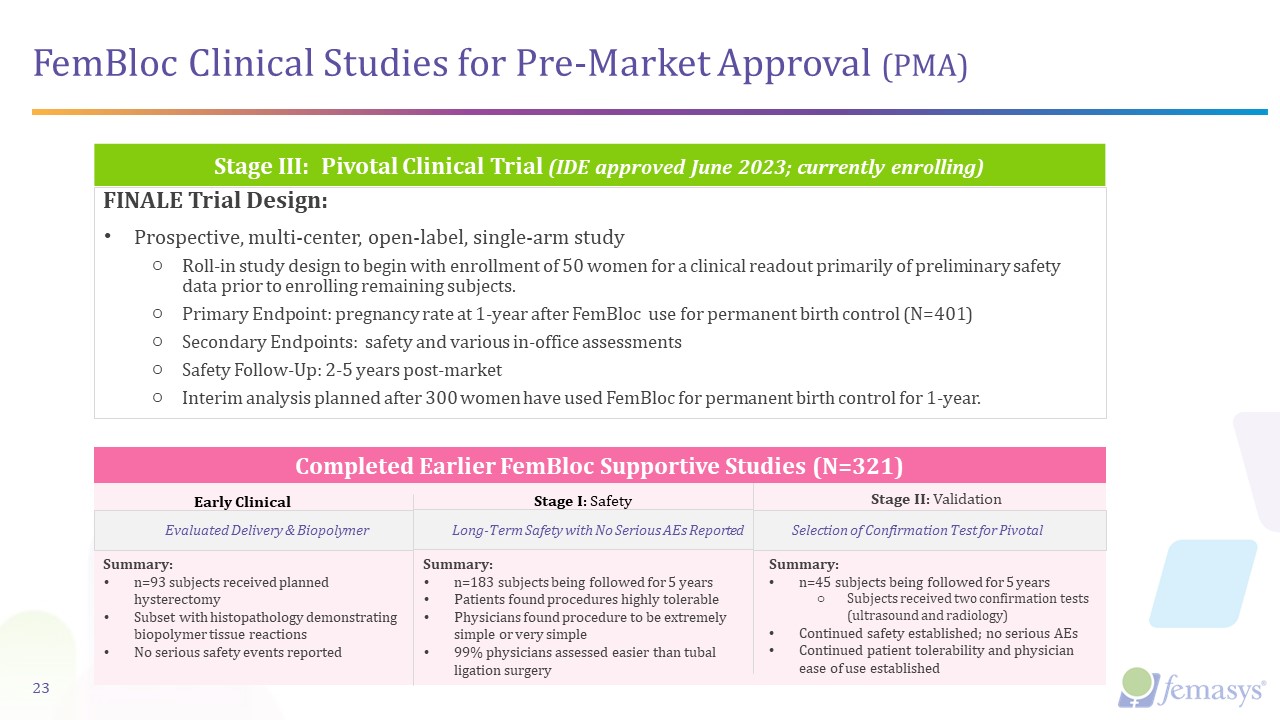Completed Earlier FemBloc Supportive Studies (N=321)  Stage I: Safety  FemBloc Clinical Studies for Pre-Market Approval (PMA)  23  Stage III: Pivotal Clinical Trial (IDE approved June 2023; currently enrolling)  FINALE Trial Design:  Prospective, multi-center, open-label, single-arm study  Roll-in study design to begin with enrollment of 50 women for a clinical readout primarily of preliminary safety data prior to enrolling remaining subjects.  Primary Endpoint: pregnancy rate at 1-year after FemBloc use for permanent birth control (N=401)  Secondary Endpoints: safety and various in-office assessments  Safety Follow-Up: 2-5 years post-market  Interim analysis planned after 300 women have used FemBloc for permanent birth control for 1-year.  Selection of Confirmation Test for Pivotal  Stage II: Validation  Early Clinical  Long-Term Safety with No Serious AEs Reported   Evaluated Delivery & Biopolymer  Summary:  n=45 subjects being followed for 5 years   Subjects received two confirmation tests (ultrasound and radiology)   Continued safety established; no serious AEs  Continued patient tolerability and physician ease of use established  Summary:  n=183 subjects being followed for 5 years   Patients found procedures highly tolerable   Physicians found procedure to be extremely simple or very simple  99% physicians assessed easier than tubal ligation surgery  Summary:  n=93 subjects received planned hysterectomy   Subset with histopathology demonstrating biopolymer tissue reactions  No serious safety events reported
