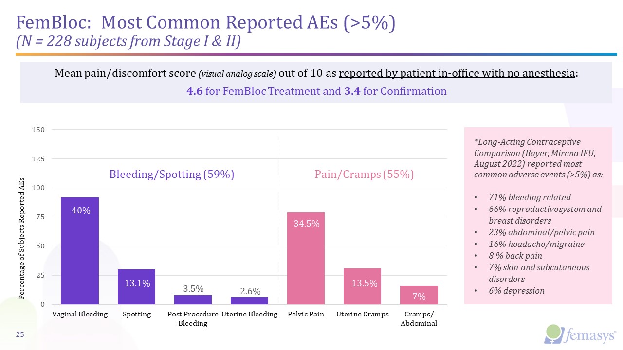 Bleeding/Spotting (59%)  Pain/Cramps (55%)  40%  13.1%  3.5%  2.6%  34.5%  13.5%  7%  *Long-Acting Contraceptive Comparison (Bayer, Mirena IFU, August 2022) reported most common adverse events (>5%) as:  71% bleeding related  66% reproductive system and breast disorders   23% abdominal/pelvic pain  16% headache/migraine  8 % back pain  7% skin and subcutaneous disorders  6% depression  FemBloc: Most Common Reported AEs (>5%)(N = 228 subjects from Stage I & II)  Mean pain/discomfort score (visual analog scale) out of 10 as reported by patient in-office with no anesthesia:   4.6 for FemBloc Treatment and 3.4 for Confirmation  25
