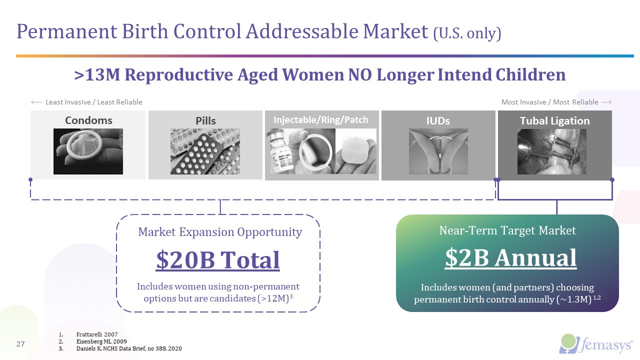 Permanent Birth Control Addressable Market (U.S. only)  27  Pills  Condoms  Injectable/Ring/Patch  IUDs  Tubal Ligation  Least Invasive / Least Reliable  Most Invasive / Most Reliable  $20B Total  Includes women using non-permanent options but are candidates (>12M)3  Market Expansion Opportunity  $2B Annual  Near-Term Target Market  Includes women (and partners) choosing permanent birth control annually (~1.3M) 1,2  >13M Reproductive Aged Women NO Longer Intend Children  Frattarelli 2007  Eisenberg ML 2009  Daniels K. NCHS Data Brief, no 388. 2020