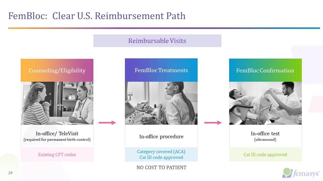 In-office procedure  FemBloc Treatments  Category covered (ACA)  Cat III code approved  FemBloc: Clear U.S. Reimbursement Path  Reimbursable Visits  In-office/ TeleVisit(required for permanent birth control)  Counseling/Eligibility  Existing CPT codes  In-office test   (ultrasound)  Cat III code approved  FemBloc Confirmation  29  NO COST TO PATIENT