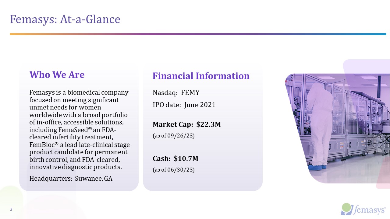 Femasys: At-a-Glance  Who We Are  Financial Information  Femasys is a biomedical company focused on meeting significant unmet needs for women worldwide with a broad portfolio of in-office, accessible solutions, including FemaSeed® an FDA-cleared infertility treatment, FemBloc® a lead late-clinical stage product candidate for permanent birth control, and FDA-cleared, innovative diagnostic products.  Headquarters: Suwanee, GA  Nasdaq: FEMY  IPO date: June 2021   Market Cap: $22.3M  (as of 09/26/23)     Cash: $10.7M  (as of 06/30/23)  3