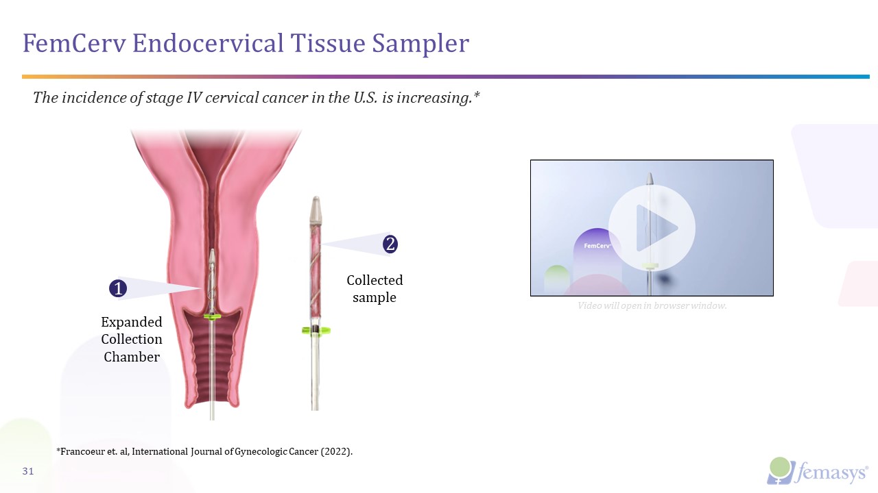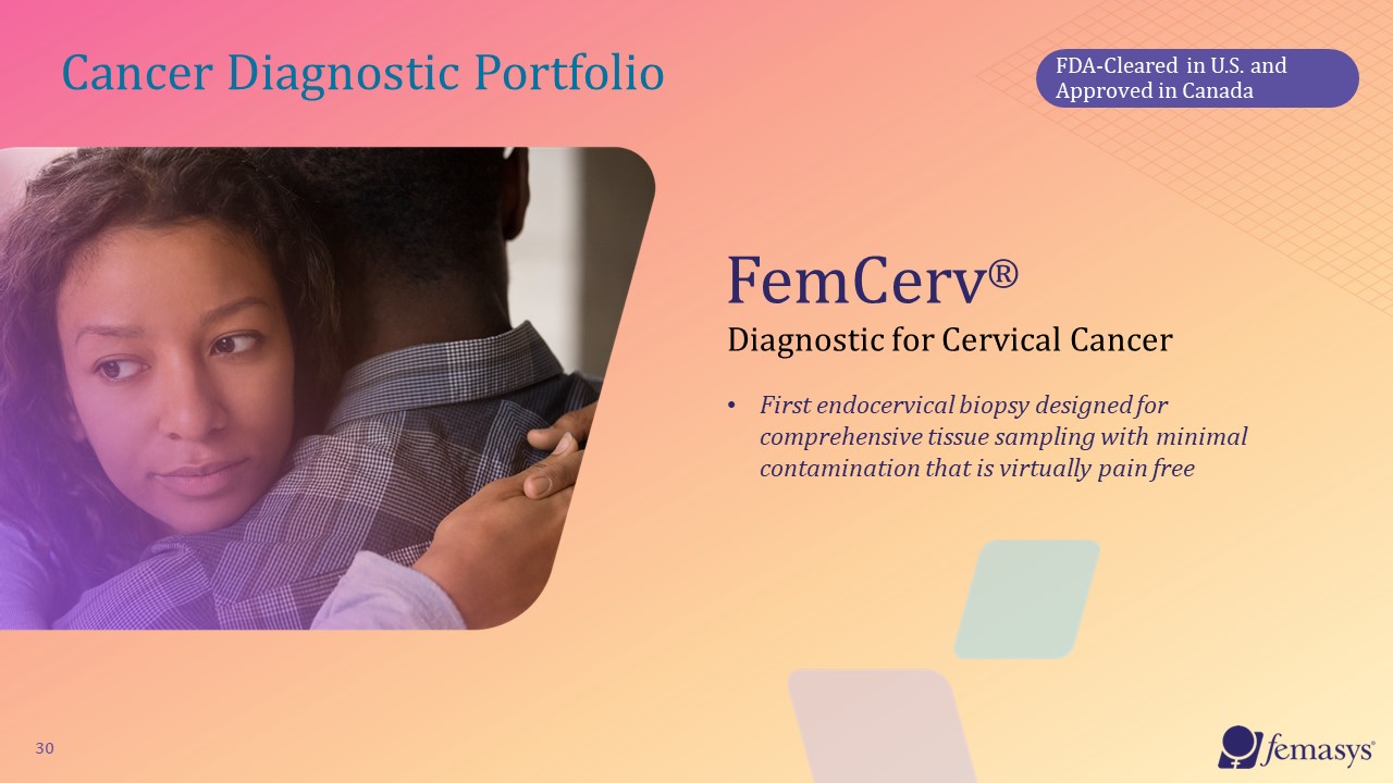 30  FemCerv®  Diagnostic for Cervical Cancer   First endocervical biopsy designed for comprehensive tissue sampling with minimal contamination that is virtually pain free  Cancer Diagnostic Portfolio  FDA-Cleared in U.S. and Approved in Canada