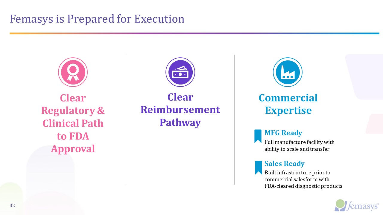 Femasys is Prepared for Execution  32  Clear Regulatory & Clinical Path to FDA Approval  Clear Reimbursement Pathway  Commercial Expertise  Full manufacture facility with ability to scale and transfer  MFG Ready  Sales Ready  Built infrastructure prior to commercial salesforce with FDA-cleared diagnostic products