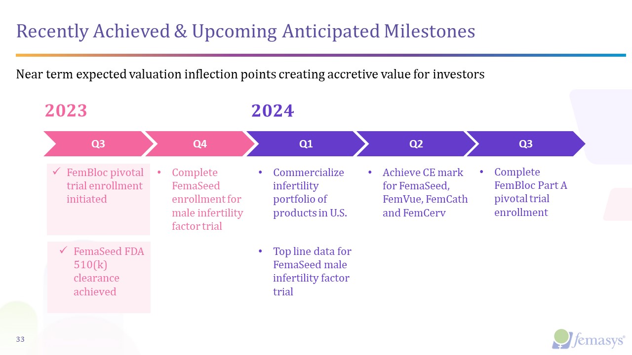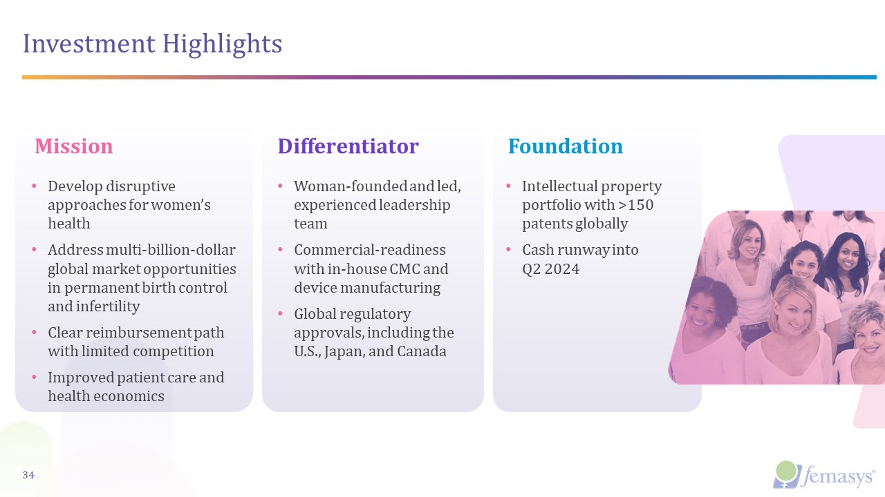 Recently Achieved & Upcoming Anticipated Milestones  Near term expected valuation inflection points creating accretive value for investors  33  2024  Q2  Complete FemaSeed enrollment for male infertility factor trial   Q3  2023  FemBloc pivotal trial enrollment initiated   Q4  Q1  Commercialize infertility portfolio of products in U.S.     FemaSeed FDA 510(k) clearance achieved  Top line data for FemaSeed male infertility factor trial     Achieve CE mark for FemaSeed, FemVue, FemCath and FemCerv  Q3  Complete FemBloc Part A pivotal trial enrollment