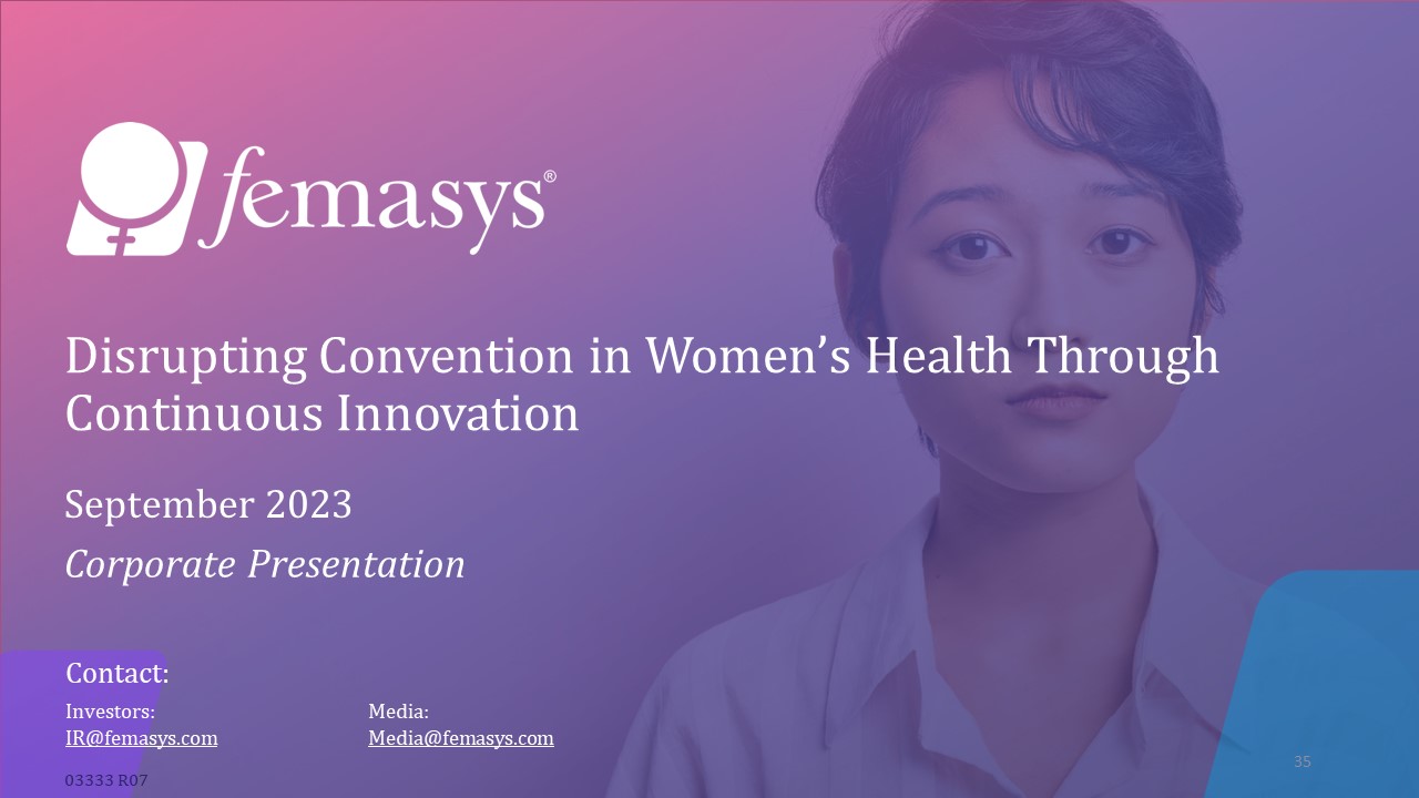 Disrupting Convention in Women’s Health Through Continuous Innovation  September 2023  Corporate Presentation  Investors:   IR@femasys.com  Contact:   Media:  Media@femasys.com   35  03333 R07