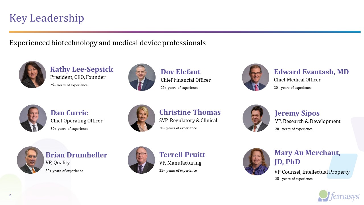 Investment Highlights  Differentiator  4  Develop disruptive approaches for women’s health   Address multi-billion-dollar global market opportunities in permanent birth control and infertility   Clear reimbursement path with limited competition   Improved patient care and health economics  Intellectual property portfolio with >150 patents globally  Cash runway into Q2 2024  Woman-founded and led, experienced leadership team  Commercial-readiness with in-house CMC and device manufacturing  Global regulatory approvals, including the U.S., Japan, and Canada   Mission  Foundation