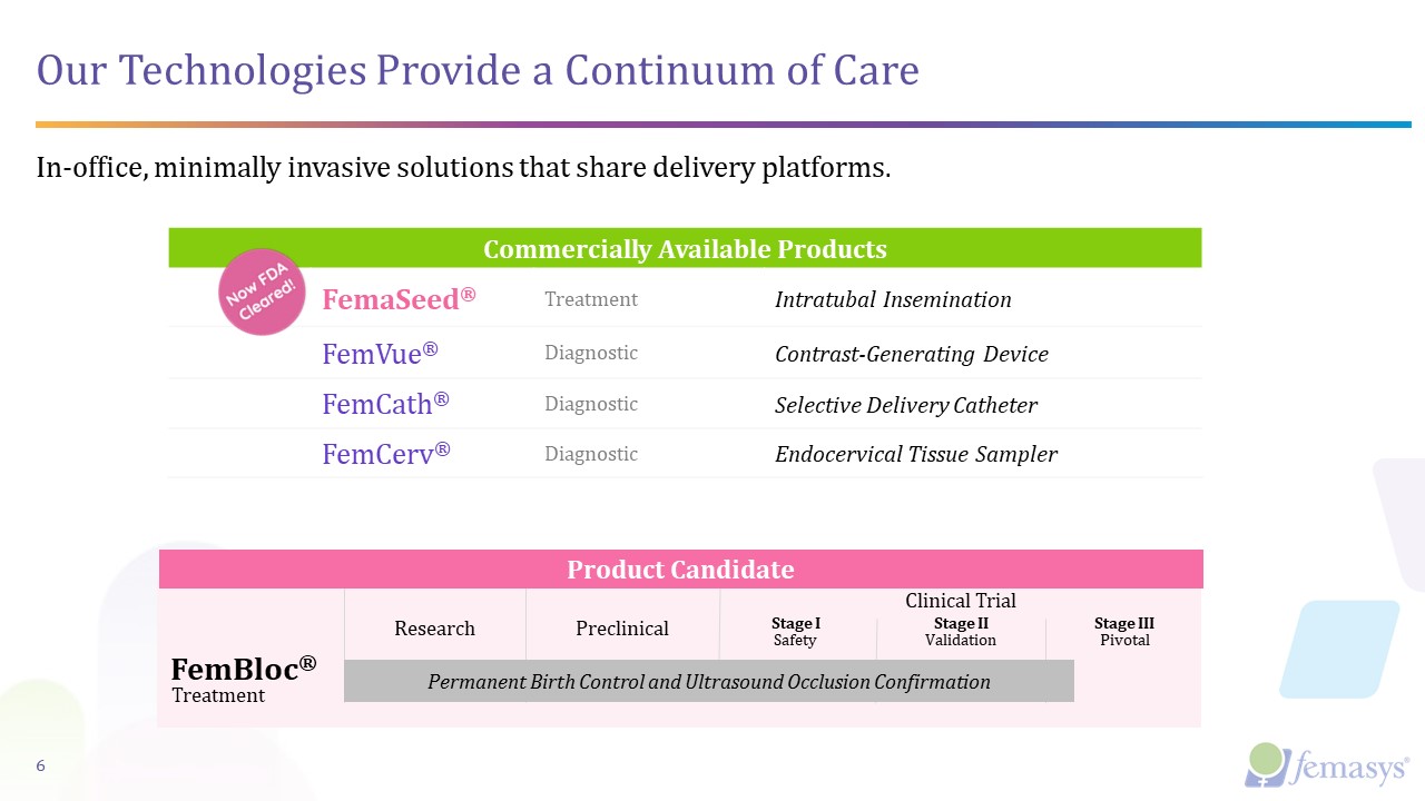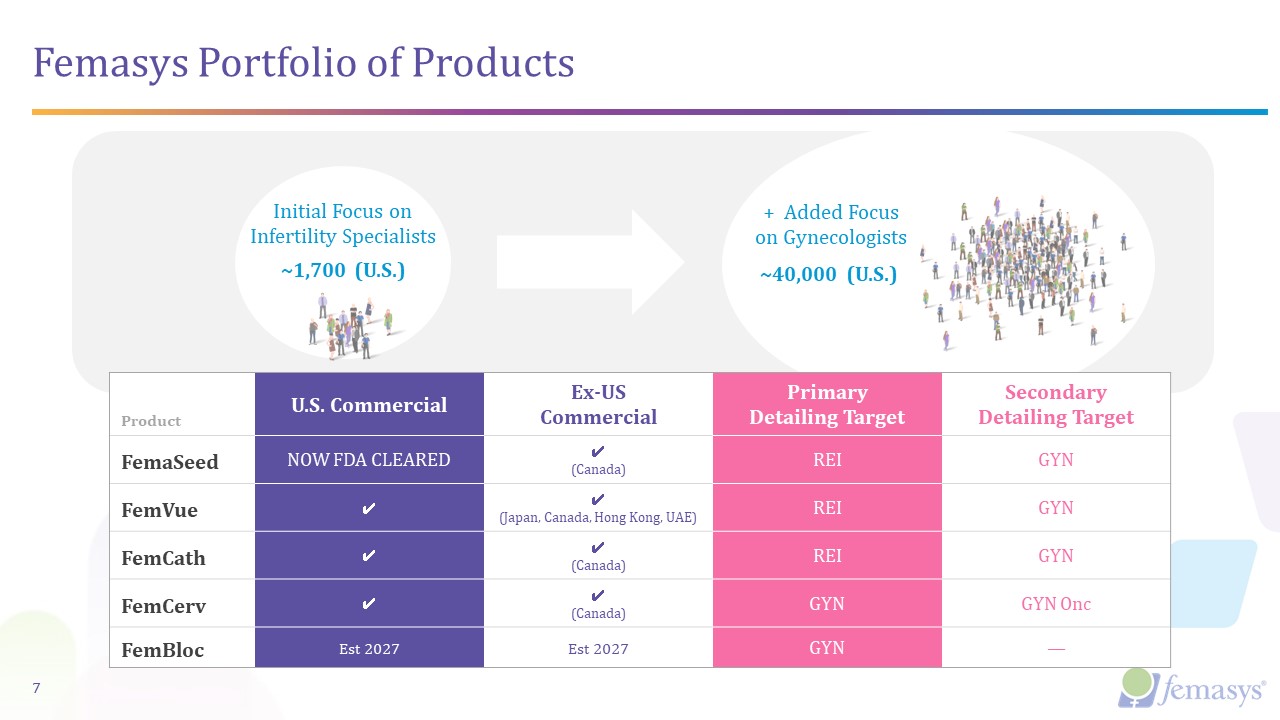 FemBloc®  Product Candidate  Research  Preclinical  Stage ISafety  Stage IIValidation  Stage IIIPivotal  Our Technologies Provide a Continuum of Care  Permanent Birth Control and Ultrasound Occlusion Confirmation  6  In-office, minimally invasive solutions that share delivery platforms.  Commercially Available Products  Commercially Available Products  FemaSeed®  Treatment  Intratubal Insemination  FemVue®  Diagnostic  Contrast-Generating Device  FemCath®  Diagnostic  Selective Delivery Catheter  FemCerv®  Diagnostic  Endocervical Tissue Sampler  Treatment  Clinical Trial