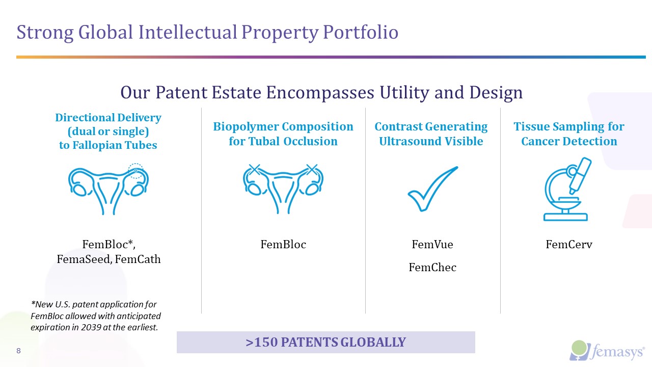 Femasys Portfolio of Products  7  Initial Focus on Infertility Specialists   + Added Focus   on Gynecologists  ~1,700 (U.S.)  ~40,000 (U.S.)  Product  U.S. Commercial  Ex-US  Commercial  Primary   Detailing Target  Secondary   Detailing Target  FemaSeed  NOW FDA CLEARED  ✔  (Canada)  REI  GYN  FemVue  ✔  ✔  (Japan, Canada, Hong Kong, UAE)  REI  GYN  FemCath  ✔  ✔  (Canada)  REI  GYN  FemCerv  ✔  ✔  (Canada)  GYN  GYN Onc  FemBloc  Est 2027  Est 2027  GYN  —