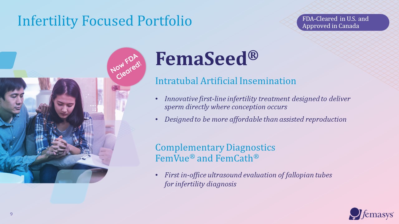 Strong Global Intellectual Property Portfolio  Our Patent Estate Encompasses Utility and Design  >150 patents globally  Directional Delivery (dual or single)   to Fallopian Tubes  Biopolymer Composition for Tubal Occlusion  Contrast Generating Ultrasound Visible  Tissue Sampling for Cancer Detection  FemBloc*, FemaSeed, FemCath  FemBloc  FemVue  FemCerv  FemChec  8  *New U.S. patent application for FemBloc allowed with anticipated expiration in 2039 at the earliest.
