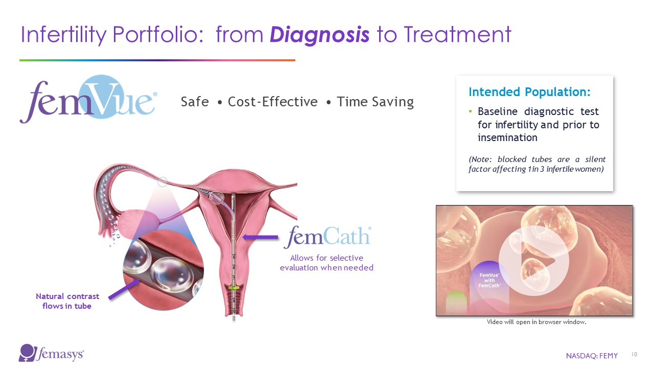 Delivers sperm to site of conception  NO CATHETERIZATION  Video will open in browser window.  Intended Population:  Infertile women/ couples  Patients desiring insemination, including same sex couples & single women  NASDAQ: FEMY  11  Requires at least one open fallopian tube  (FemVue can confirm first)  Safe  Cost-Effective   Enhance Fertilization  Infertility Portfolio: from Diagnosis to Treatment