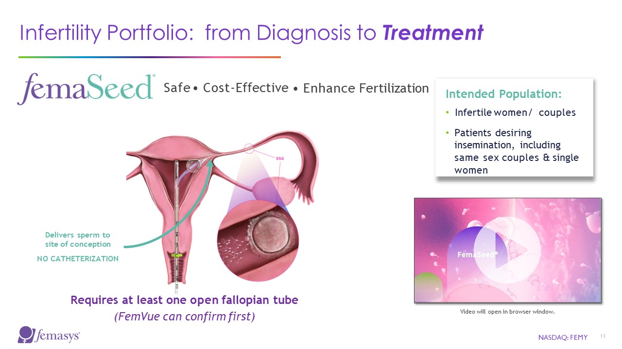 Natural contrast flows in tube  Allows for selective evaluation when needed  Video will open in browser window.  Intended Population:  Baseline diagnostic test for infertility and prior to insemination  (Note: blocked tubes are a silent factor affecting 1 in 3 infertile women)  NASDAQ: FEMY  10  Safe  Cost-Effective  Time Saving  Infertility Portfolio: from Diagnosis to Treatment