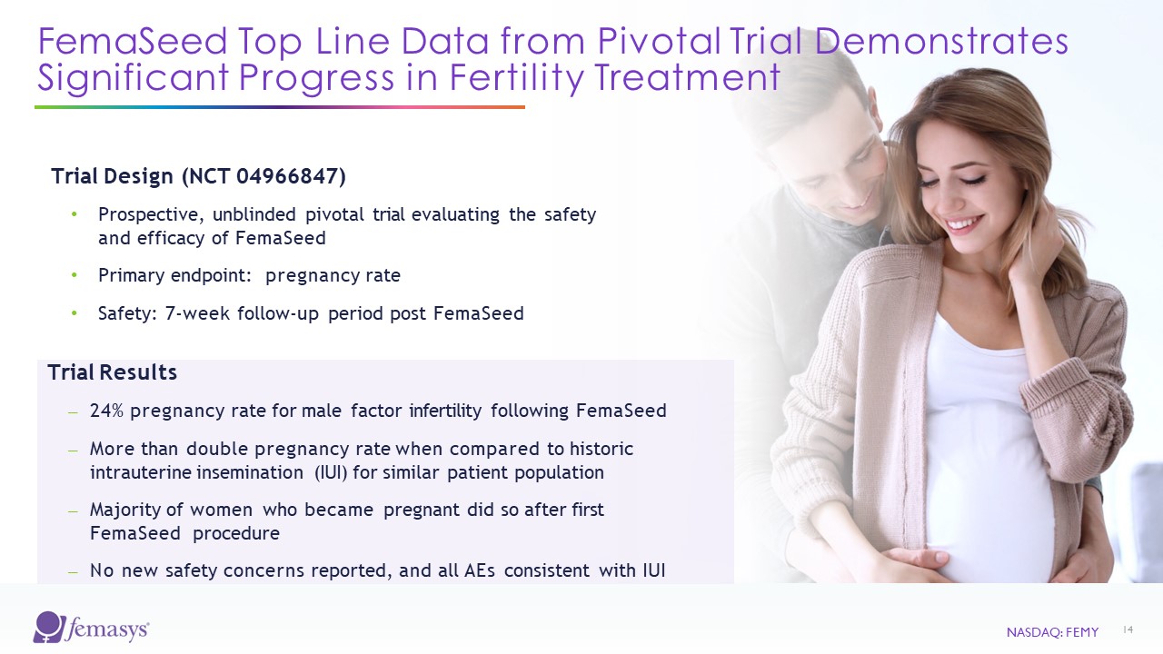 FemaSeed Offers Significant Competitive Advantages  NASDAQ: FEMY  13  Assisted Reproductive Approaches  Artificial Insemination  IVF  ICSI  IUI  No surgery  No egg retrieval or storage  No required injections  Delivery to fallopian tubes (site of conception)  NA  NA  Cost-effective  Minimal safety risks  Low male sperm count efficacy  Single fallopian tube solution  NA  NA  Widespread accessibility  Varies  Varies