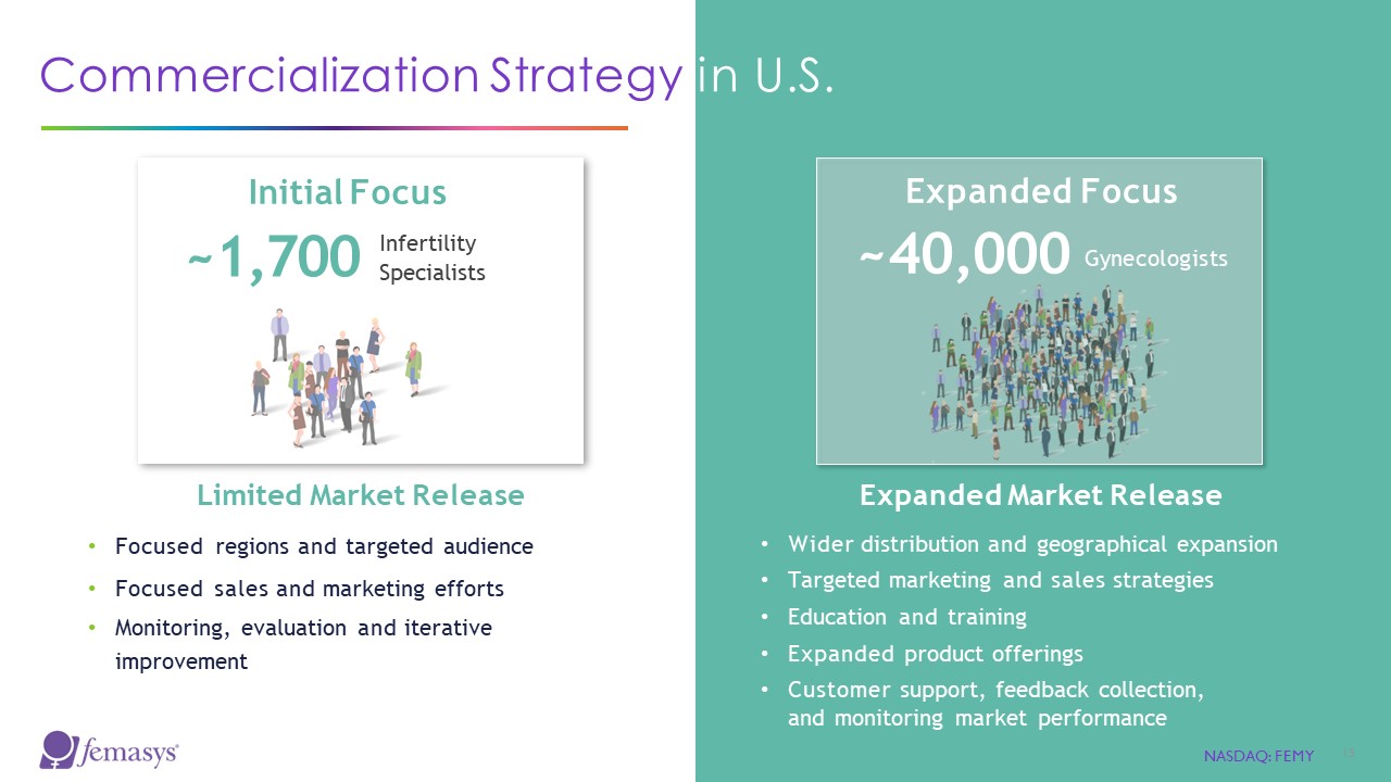 FemaSeed Top Line Data from Pivotal Trial Demonstrates Significant Progress in Fertility Treatment  NASDAQ: FEMY  14  Trial Results  ⎼ 24% pregnancy rate for male factor infertility following FemaSeed  ⎼ More than double pregnancy rate when compared to historic intrauterine insemination (IUI) for similar patient population  ⎼ Majority of women who became pregnant did so after first FemaSeed procedure  ⎼ No new safety concerns reported, and all AEs consistent with IUI  Trial Design (NCT 04966847)  Prospective, unblinded pivotal trial evaluating the safety and efficacy of FemaSeed  Primary endpoint: pregnancy rate  Safety: 7-week follow-up period post FemaSeed