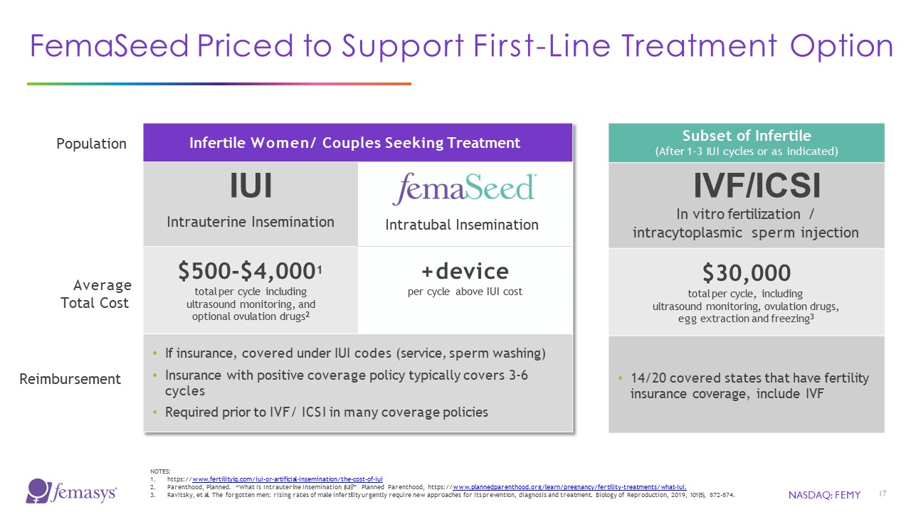 NASDAQ: FEMY  17  FemaSeed Priced to Support First-Line Treatment Option  Infertile Women/ Couples Seeking Treatment  IUI  Intrauterine Insemination  Intratubal Insemination  $500-$4,0001  total per cycle including ultrasound monitoring, and optional ovulation drugs2  + device  per cycle above IUI cost  If insurance, covered under IUI codes (service, sperm washing)  Insurance with positive coverage policy typically covers 3-6 cycles  Required prior to IVF/ ICSI in many coverage policies  Subset of Infertile  (After 1-3 IUI cycles or as indicated)  IVF/ICSI  In vitro fertilization / intracytoplasmic sperm injection  $30,000  total per cycle, including ultrasound monitoring, ovulation drugs,  egg extraction and freezing3  14/20 covered states that have fertility insurance coverage, include IVF  Population  Average Total Cost  Reimbursement  NOTES:  https://www.fertilityiq.com/iui-or-artificial-insemination/the-cost-of-iui  Parenthood, Planned. “What Is Intrauterine Insemination (IUI)?” Planned Parenthood, https://www.plannedparenthood.org/learn/pregnancy/fertility-treatments/what-iui.  Ravitsky, et al. The forgotten men: rising rates of male infertility urgently require new approaches for its prevention, diagnosis and treatment. Biology of Reproduction, 2019, 101(5), 872-874.