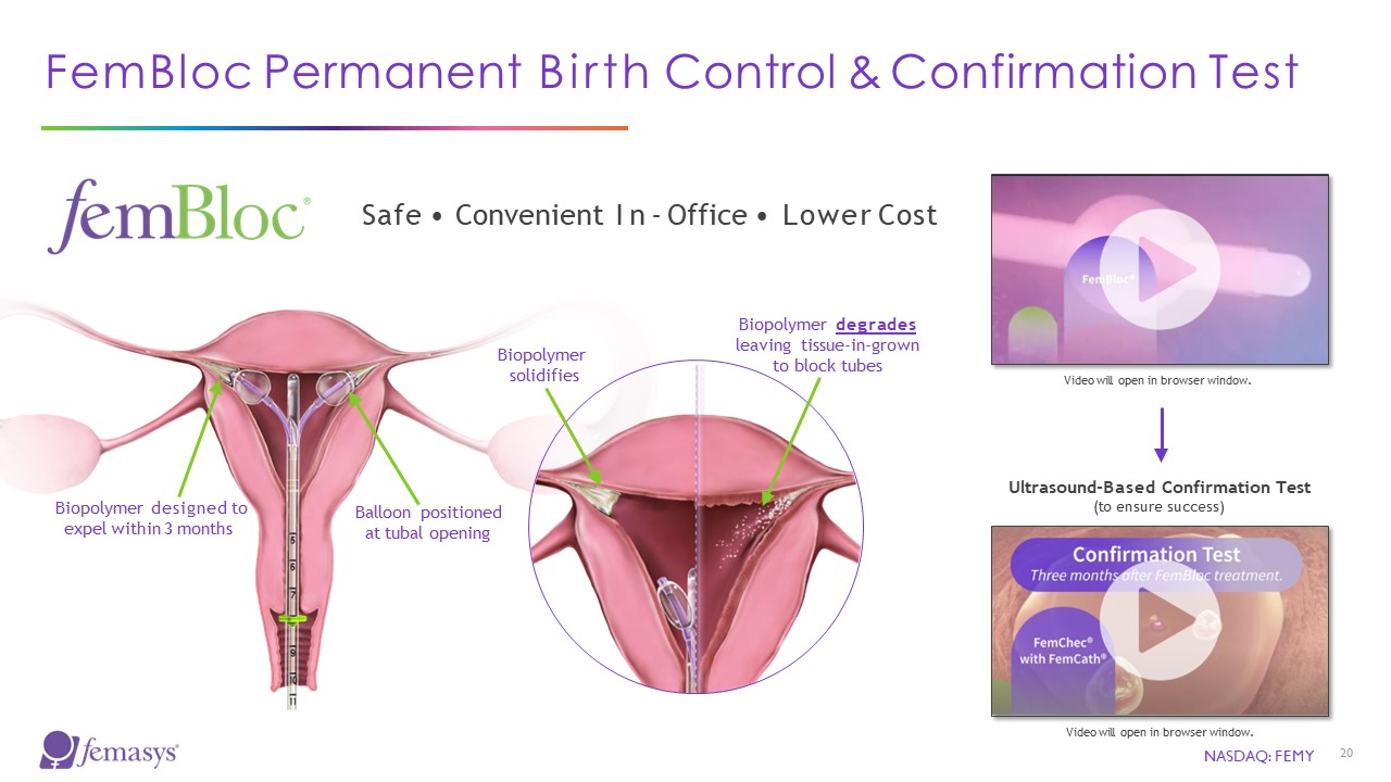 FemBloc Permanent Birth Control & Confirmation Test  Biopolymer designed to expel within 3 months  Balloon positioned at tubal opening  Biopolymer solidifies  Biopolymer degrades leaving tissue-in-grown to block tubes  Video will open in browser window.  Video will open in browser window.  Ultrasound-Based Confirmation Test  (to ensure success)  Safe • Convenient In-Office • Lower Cost  NASDAQ: FEMY  20