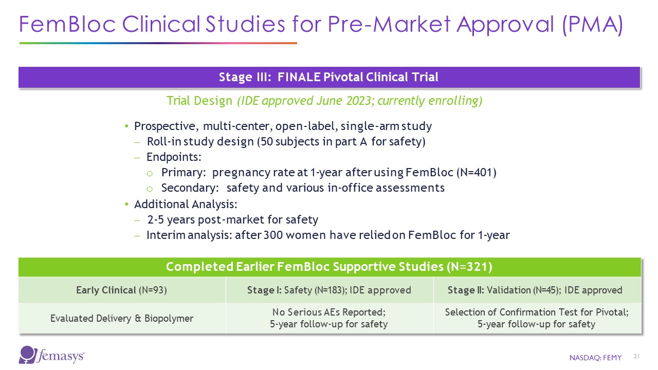 FemBloc Clinical Studies for Pre-Market Approval (PMA)  Stage III: FINALE Pivotal Clinical Trial  Trial Design (IDE approved June 2023; currently enrolling)  Prospective, multi-center, open-label, single-arm study  ⎼ Roll-in study design (50 subjects in part A for safety)  ⎼ Endpoints:  Primary: pregnancy rate at 1-year after using FemBloc (N=401)  Secondary: safety and various in-office assessments  Additional Analysis:  ⎼ 2-5 years post-market for safety  ⎼ Interim analysis: after 300 women have relied on FemBloc for 1-year  Completed Earlier FemBloc Supportive Studies (N=321)  Early Clinical (N=93)  Stage I: Safety (N=183); IDE approved  Stage II: Validation (N=45); IDE approved  Evaluated Delivery & Biopolymer  No Serious AEs Reported; 5-year follow-up for safety  Selection of Confirmation Test for Pivotal; 5-year follow-up for safety  NASDAQ: FEMY  21