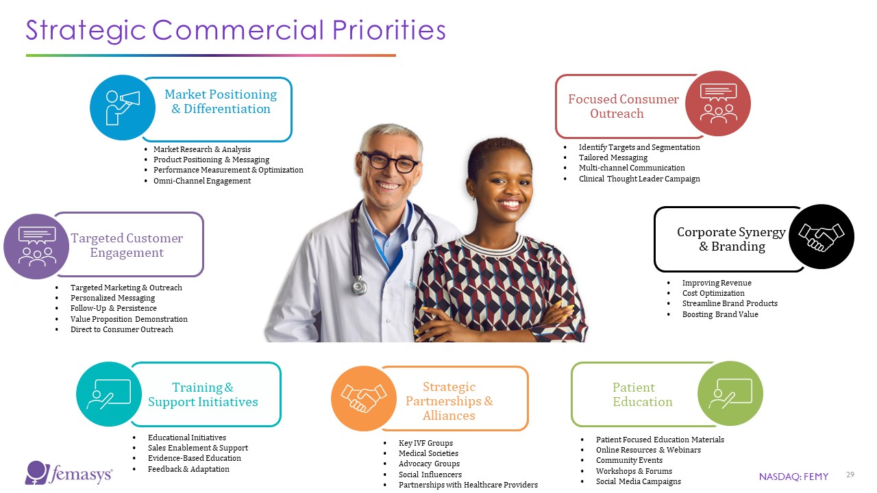 Strategic Commercial Priorities  Market Positioning & Differentiation  Targeted Customer Engagement  Training & Support Initiatives  Strategic Partnerships & Alliances  Corporate Synergy & Branding  Patient Education  NASDAQ: FEMY  29  Market Research & Analysis  Product Positioning & Messaging  Performance Measurement & Optimization  Omni-Channel Engagement  Educational Initiatives  Sales Enablement & Support  Evidence-Based Education  Feedback & Adaptation  Targeted Marketing & Outreach  Personalized Messaging  Follow-Up & Persistence  Value Proposition Demonstration  Direct to Consumer Outreach  Key IVF Groups  Medical Societies  Advocacy Groups  Social Influencers  Partnerships with Healthcare Providers  Focused Consumer Outreach  Improving Revenue  Cost Optimization  Streamline Brand Products  Boosting Brand Value  Patient Focused Education Materials  Online Resources & Webinars  Community Events  Workshops & Forums  Social Media Campaigns  Identify Targets and Segmentation  Tailored Messaging  Multi-channel Communication  Clinical Thought Leader Campaign