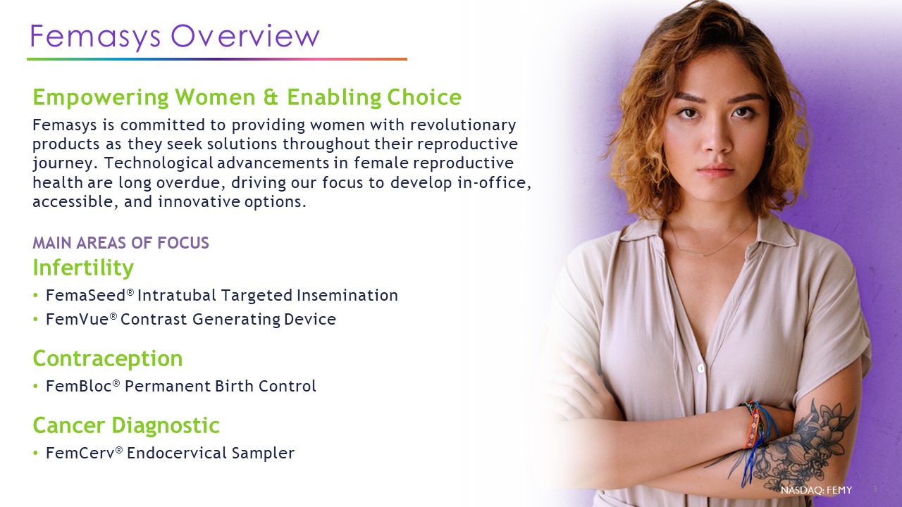 This Presentation contains "forward-looking statements" within the meaning of the Private Securities Litigation Reform Act of 1995 relating to our business, operations and financial conditions, including but not limited to current beliefs, expectations and assumptions regarding the future of our business, future plans and strategies, results of clinical trials and other future conditions. Words such as, but not limited to, "anticipate", "believe", "could", "estimate", "expect", "intend", "may", "plan", "potential", "predict", "project", "should", "will", "would" or the negative of those terms, and similar expressions that convey uncertainty of future events or outcomes, identify forward-looking statements.  These forward-looking statements reflect management's beliefs and views with respect to future events and are based on estimates and assumptions as of the date of this Presentation and are subject to risks and uncertainties. Moreover, the Company operates in a very competitive and rapidly changing environment. New risks emerge from time to time. It is not possible for management to predict all risks, nor can the Company assess the impact of all factors on its business or the extent to which any factor, or combination of factors, may cause actual results to differ materially from those contained in any forward-looking statements we may make. Given these uncertainties, you should not place undue reliance on these forward-looking statements. The Company qualifies all of the forward-looking statements in this Presentation by these cautionary statements. Except as required by law, the Company undertakes no obligation to publicly update any forward-looking statements, whether as a result of new information, future events or otherwise.  Statements contained herein are made as of the date of this Presentation unless stated otherwise, and neither this Presentation, nor any sale of securities, shall under any circumstances create an implication that the information contained herein is correct as of any time after such date or that the information will be updated or revisited to reflect information that subsequently becomes available or changes occurring after that date hereof.  Certain information contained in this Presentation relates to or is based on statistical and other industry and market data obtained from independent industry publications and research, surveys and studies conducted by independent third parties as well as the Company's own estimates. The market data used in this Presentation involves a number of assumptions and limitations, and you are cautioned not to give undue weight to such data. Industry publications and third-party research, surveys and studies generally indicate that their information has been obtained from sources believed to be reliable, although they do not guarantee the accuracy or completeness of such information. The Company's estimates of the total addressable market of the patient population with the potential to benefit from treatment with any products and product candidates the Company may develop, our ability to commercialize our products and product candidates, or the effect of delays in commercializing include several key assumptions based on its industry knowledge, industry publications and third-party research, which may be based on a small sample size and may fail to accurately reflect the addressable patient population. While the Company believes that its internal assumptions are reasonable, no independent source has verified such assumptions.  This Presentation contains trademarks, trade names, or service marks belonging to other entities. The Company does not intend the use or display of other parties' trade names, trademarks or service marks to imply a relationship with, or endorsement or sponsorship of, or by these other parties.  NASDAQ: FEMY  2  Forward Looking Statements