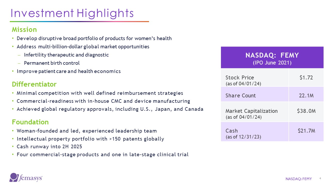 Investor presentation  April 2024  NASDAQ: FEMY  Disrupting Convention in Women’s Reproductive Health Through Continuous Innovation
