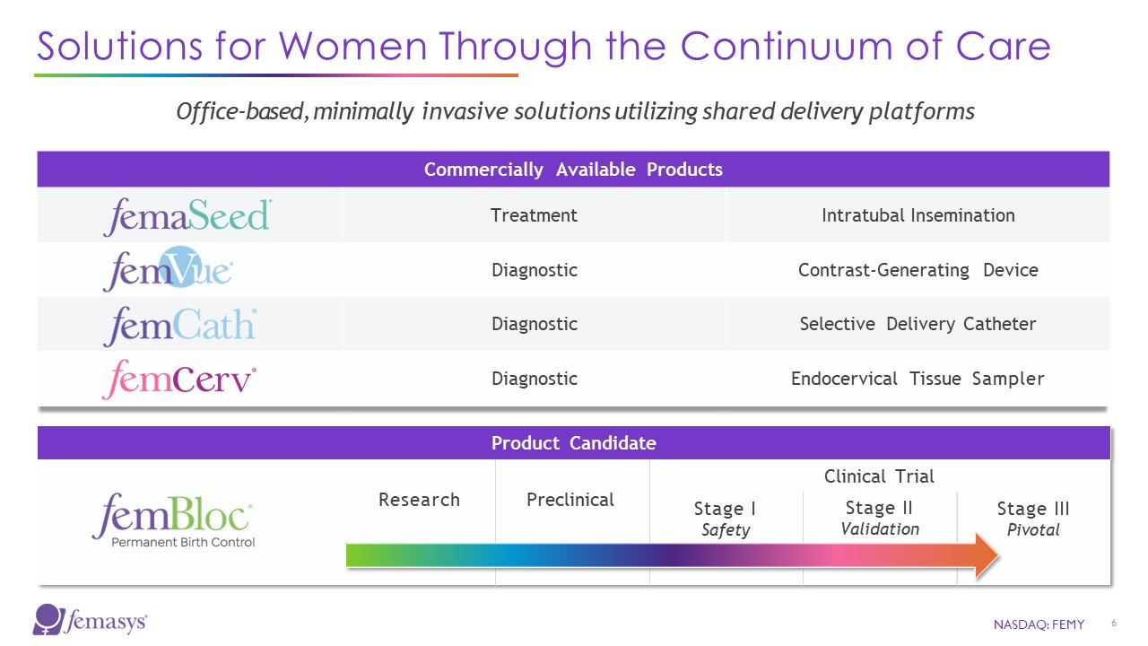 Commercially Available Products  Treatment  Intratubal Insemination  Diagnostic  Contrast-Generating Device  Diagnostic  Selective Delivery Catheter  Diagnostic  Endocervical Tissue Sampler  Office-based, minimally invasive solutions utilizing shared delivery platforms  Product Candidate  Research Preclinical  Stage I  Safety  Clinical Trial  Stage II  Validation  Stage III  Pivotal  NASDAQ: FEMY  6  Solutions for Women Through the Continuum of Care