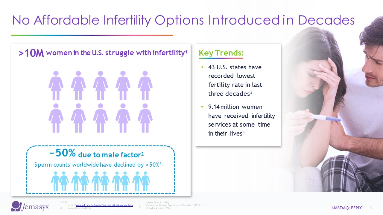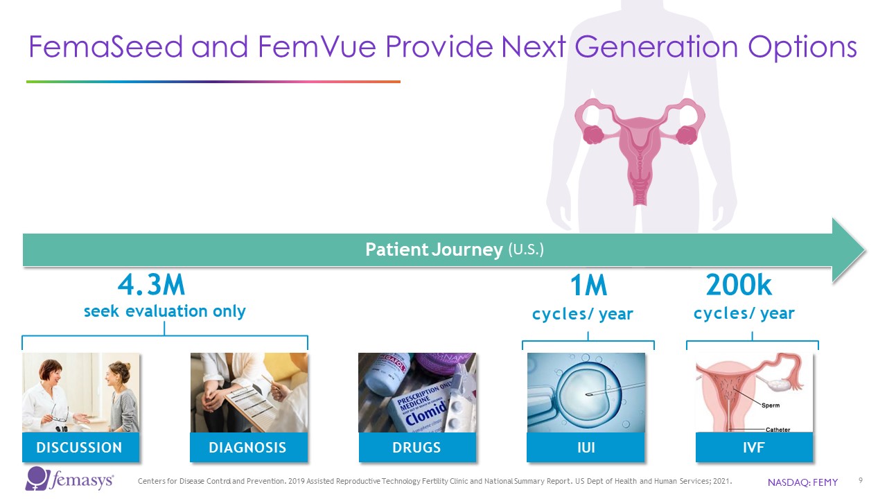 NASDAQ: FEMY  8  No Affordable Infertility Options Introduced in Decades  Key Trends:  43 U.S. states have recorded lowest fertility rate in last three decades4  9.14 million women have received infertility services at some time in their lives5  NOTES:  1.  2.  3.  4.  https://www.cdc.gov/nchs/nsfg/key_statistics/i-keystat.htm.  Kumar N, et al. (2015) 5.  Levine H. et al. (2023)  Centers for Disease Control and Prevention (2019) Chandra A, et al. (2014)  >10M women in the U.S. struggle with infertility1  ~50% due to male factor2  Sperm counts worldwide have declined by >50%3